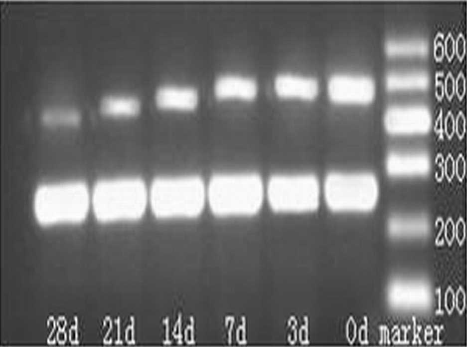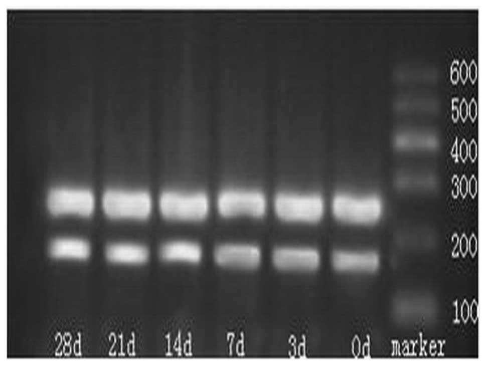 A band was noted at 263 bp (Fig. 3) that was consistent with the length of C3. Quantity One analysis software version 4.0 (Bio-Rad, Hercules, CA, USA) was employed in order to detect the OD of the C3 and the β-actin bands. Fourteen days after the STZ injection, the mRNA expression increased dramatically, as compared with that prior to the STZ injection (P<0.05), and this increase continued until 28 days after the STZ injection (Table II).