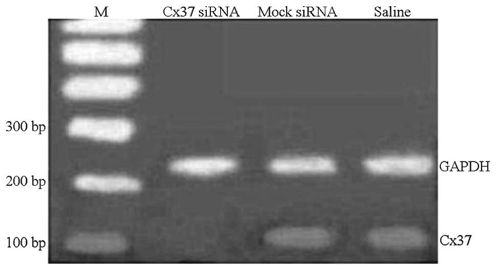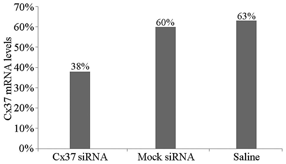 The frequency of the C allele at base pair 1019 of the Cx37 gene in patients with coronary heart disease was observed to be significantly higher as compared with that of healthy controls (17). The present in vivo study demonstrated that Cx37 gene interference in the pig resulted in a reduced volume but improved the stability of the atherosclerosis plaque. To the best of our knowledge, the present study was the first to report the effect of Cx37 RNAi in atherosclerotic plaques.