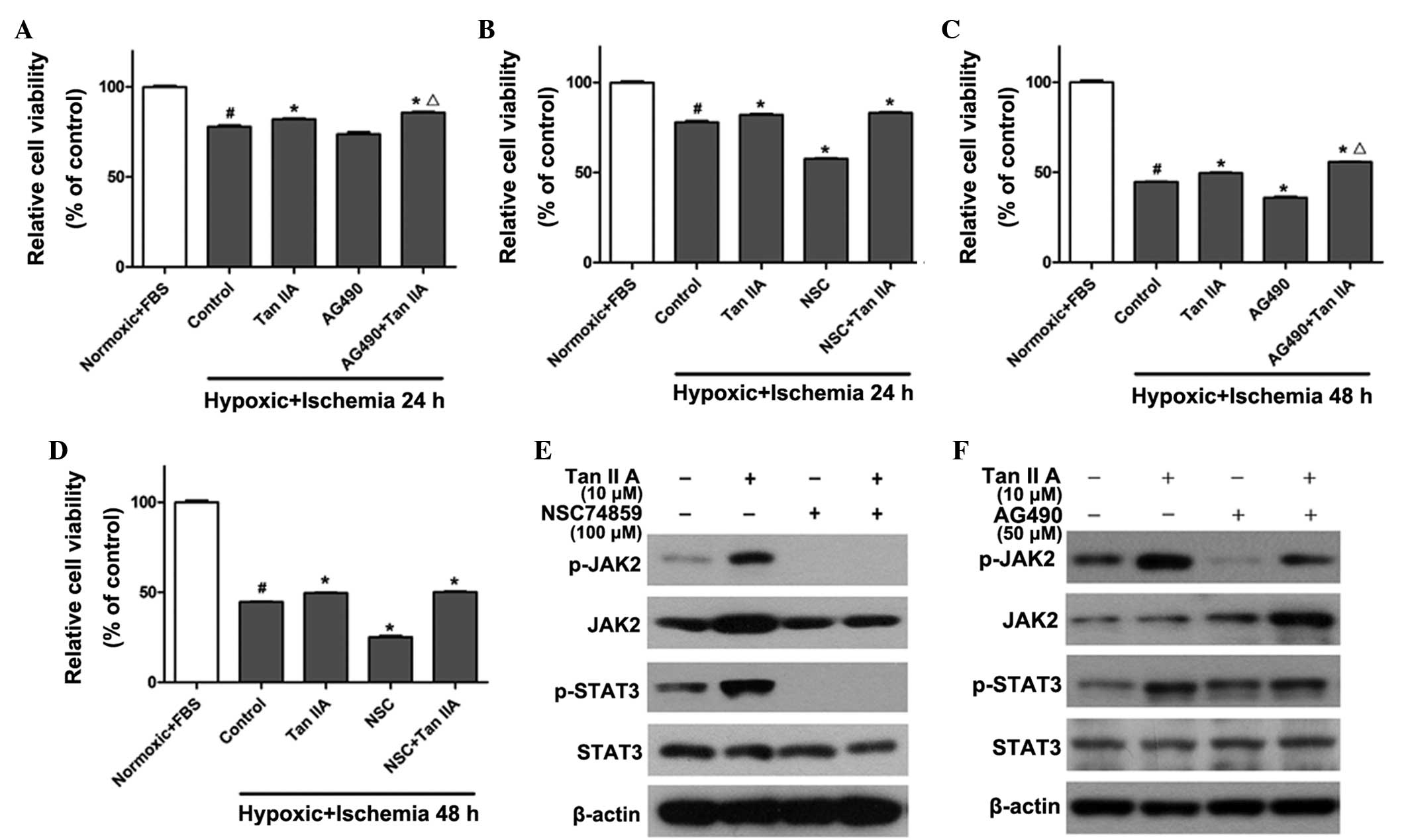 In order to further determine whether the JAK2/STAT3 signaling pathway was responsible for the protective effect of tanshinone IIA, the JAK2 inhibitor AG490 (20) and the STAT3 inhibitor NSC74859 (17) were used to treat H9c2 cells alone (50 and 100 μM, respectively) or in combination with 10 μM tanshinone IIA. As shown in Fig. 2, the viability of H9c2 cells was significantly reduced to 73±1.2% in the 24-h hypoxic ischemia-preconditioned group (Fig. 2A and B) and 44±2.3% in the 48-h hypoxic ischemia-preconditioned (Fig. 2C and D) compared to that of the normoxic and FBS groups (P<0.05). Tanshinone IIA reversed the injury and slightly restored cell viability to 80±1.1% and 49±1.4% in the groups pre-conditioned with 24 and 48 h hypoxic ischemia, respectively, which was significantly increased compared to that of the control group (P<0.05). Conversely, AG490 and NSC74859 reduced cell viability by 8±1.4% (Fig. 2A and C) and 13±2.7% (Fig. 2B and D) in the groups preconditioned with 24 and 48 h hypoxic ischemia, respectively, compared to that of the control group (P<0.05). Of note, co-administration of the JAK inhibitor AG490 with tanshinone IIA restored cell viability by 5.2±1.9% (Fig. 2A and C) in comparison with the tanshinone IIA only treatment group (P<0.05); however, no significant effects were observed following co-administration of tanshinone IIA with the STAT3 inhibitor NSC74859 (Fig. 2B and D). In addition, tanshinone IIA treatment significantly increased the phosphorylation level of JAK2 and STAT3. The level of p-JAK2 was inhibited following treatment with NSC74859 alone or NSC74859 combined with tanshinone IIA (Fig. 2E). As shown in Fig. 2F, AG490 suppressed the activation of JAK2 and STAT3; however, co-administration of tanshinone IIA and AG490 restored the phosphorylation level of JAK2 and STAT3. This therefore demonstrated that contrary to the expected result, the co-application of AG490 and tanshinone IIA did not eliminate the protective effect of tanshinone IIA, but further restored myocardial cell viability following the induction of hypoxic ischemia; furthermore, these results indicated that AG490 may affect the protective function of tanshinone IIA via inhibition of the JAK/STAT pathway.
