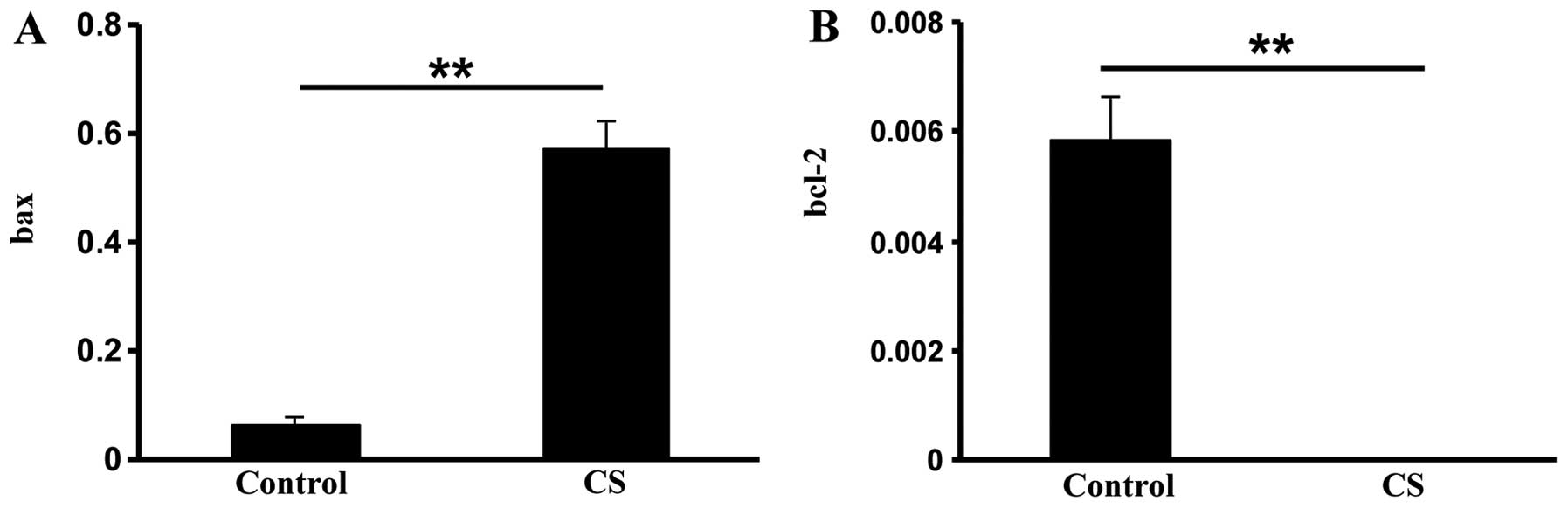 To investigate the correlation between CS-associated oxidative stress and intestinal apoptosis, we then measured pro-apoptotic bax and anti-apoptotic bcl-2 gene expression. The bax mRNA expression was over five times greater in the CS group compared with the control group (P<0.01; Fig. 2A). In addition, bcl-2 expression was significantly reduced in the CS group (P<0.01; Fig. 2B). These data suggested that CS exposure induces apoptosis in intestinal cells.
