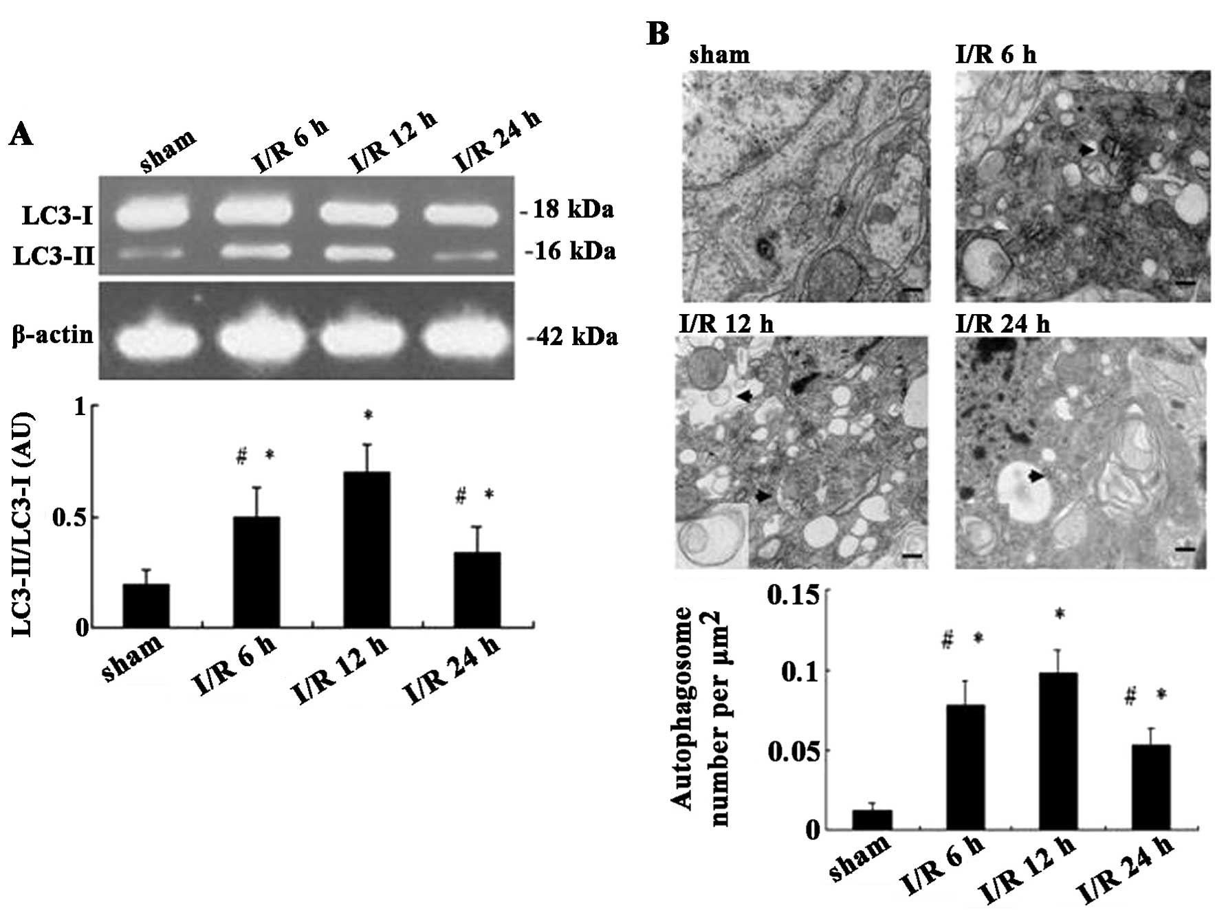 The role of autophagy in neuronal death during reperfusion remains to be fully elucidated. Accumulating evidence has suggested that autophagy activation contributed to ischemic neuronal injury following cerebral I/R (25,43); however, one study supported the opposite conclusion, that autophagy activation was associated with protective effects against neuronal injury (44). For example, Zhang et al (44) evaluated the expression of the autophagic marker LC3-II in the penumbral region 0, 1, 12, and 24 h post-reperfusion and found that levels of LC3-II/GAPDH increased with reperfusion time, and persisted until 24 h; however, the inhibition of autophagy during reperfusion enhanced I/R injury (44). The inconsistency may be due to different ischemic models, durations of the ischemic insults and ages of animals. It was reported that autophagy was more pronounced in adult mice than neonatal mice subjected to hypoxia-ischemia injury, indicating that autophagic cell death may be more significant in mature animals (45). Furthermore, the different durations of the ischemic insults may affect the role of autophagy during reperfusion.