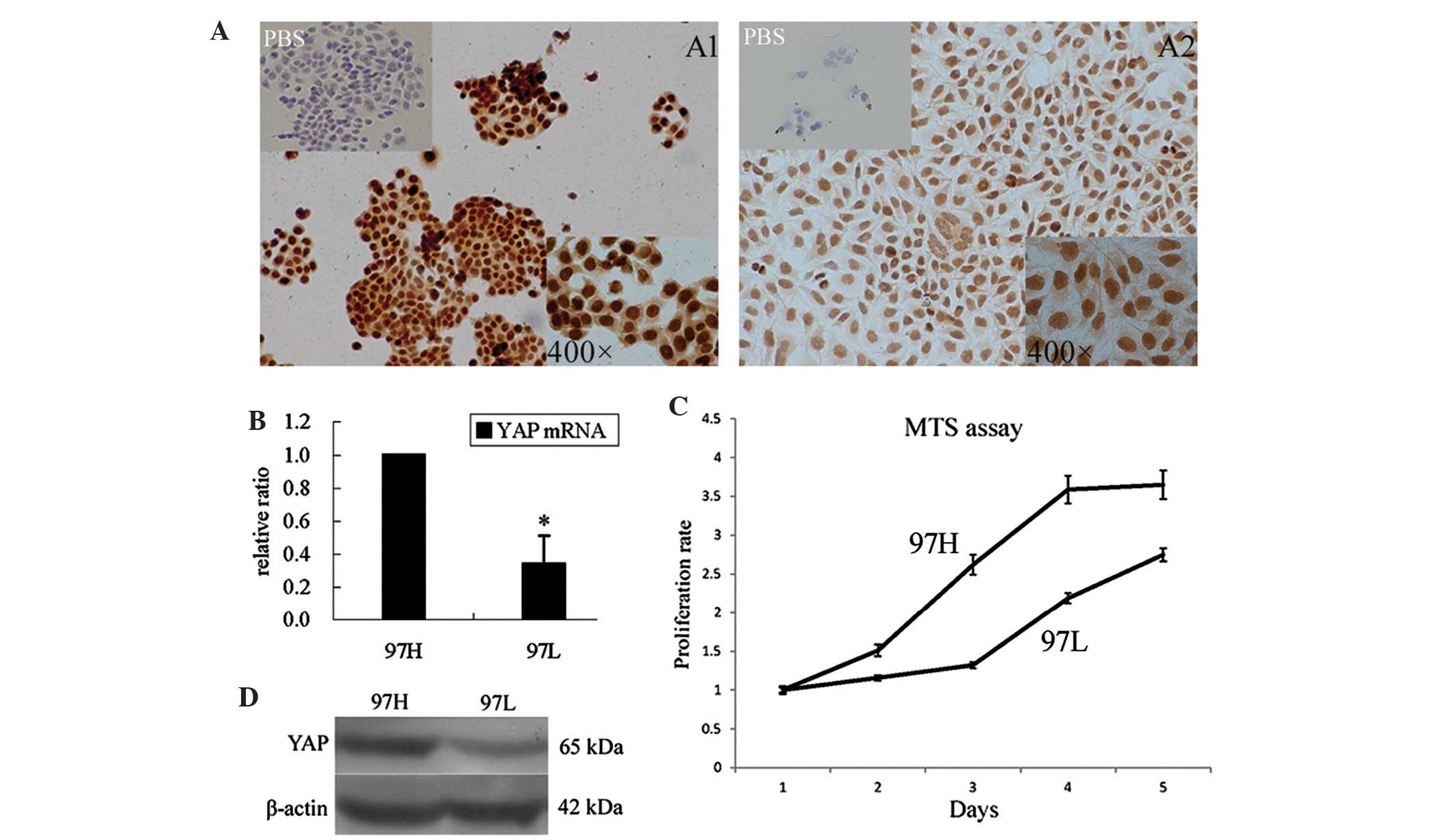 Two human HCC cell clones with high and low metastatic potential, MHCC-97H (97H) and MHCC-97L (97L), derived from the parental cell line MHCC97, have previously been established (11,12). However, the YAP expression levels and proliferation rates of these two clones of the same genetic background have not been examined.