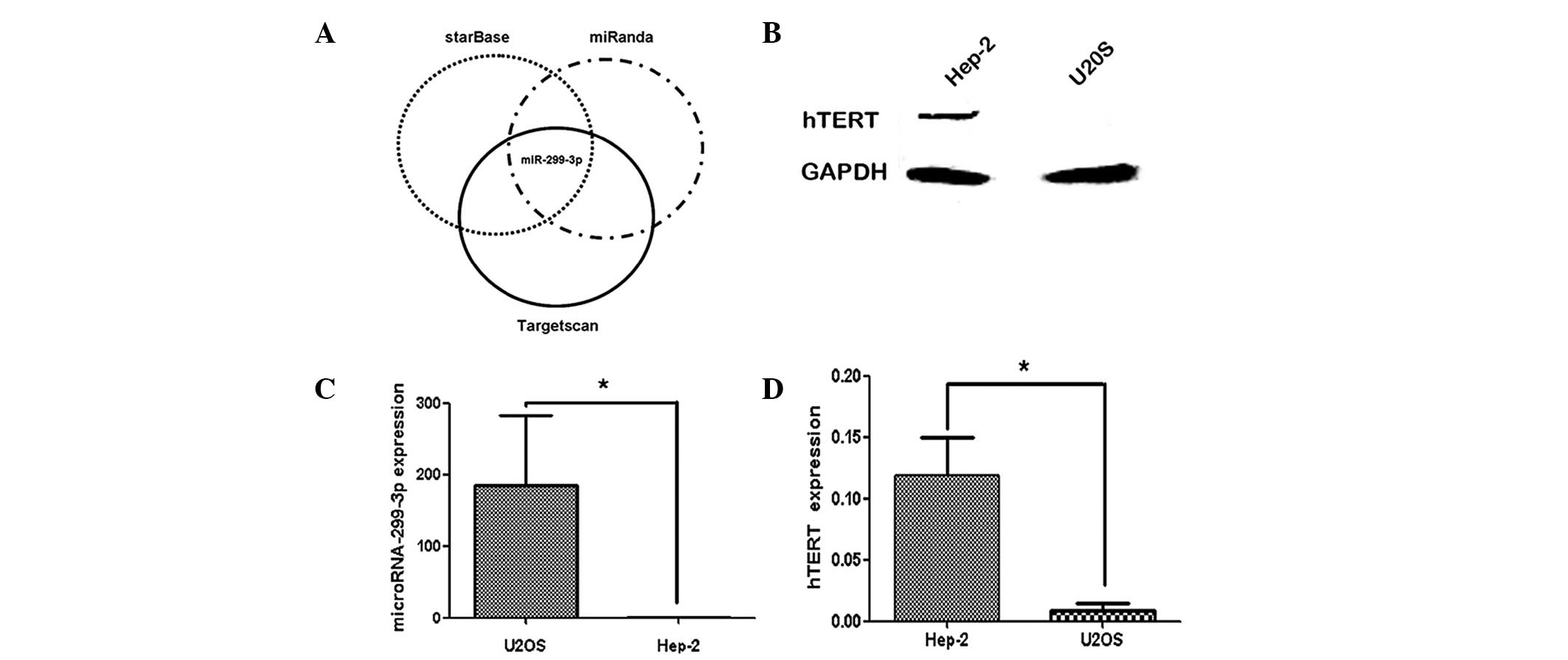 Fig. 1 shows the correlation between miR-299-3p expression and hTERT protein in Hep-2 and U2OS cells. Western blot analysis revealed that hTERT was positively expressed in the Hep-2 cells, while it was negatively expressed in U2OS cells (Fig. 1B). In addition, qPCR was used to measure the expression of miR-299-3p in the two cell lines. As shown in Fig. 1C, higher levels of miR-299-3p were observed in U2OS cell lines compared with those in Hep-2 cells. An inverse correlation was observed between the expression of miR-299-3p and hTERT protein in these two cell lines. These results indicated that the high expression of hTERT in Hep-2 cell lines was inversely correlated with the endogenous expression of miR-299-3p.