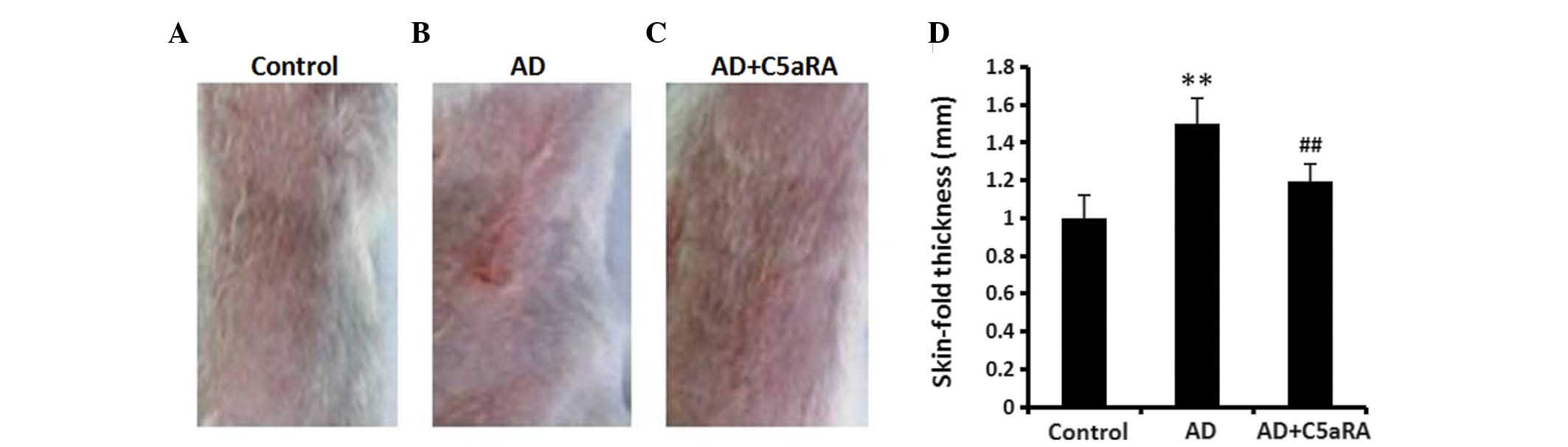 AD is an inflammatory skin disease and is distinguished by an increase in skin-fold thickness and infiltration of numerous inflammatory cells into the site of inflammation (1,2). In the present study, following DNCB application onto the BALB/c mouse dorsal skin for 2 weeks, the skin-fold thickness was significantly increased in AD mice and in addition, the increase in skin-fold thickness was significantly reduced in the mice that had received C5aRA intracutaneous injection. Similarly, the quantity of total infiltrating leukocytes (mast cells, neutrophils, lymphocytes, monocytes and a few eosinophils and basophils) and mast cells in the skin tissue were significantly increased in mice with AD, which was significantly attenuated in the mice that had received C5aRA intracutaneous injection.