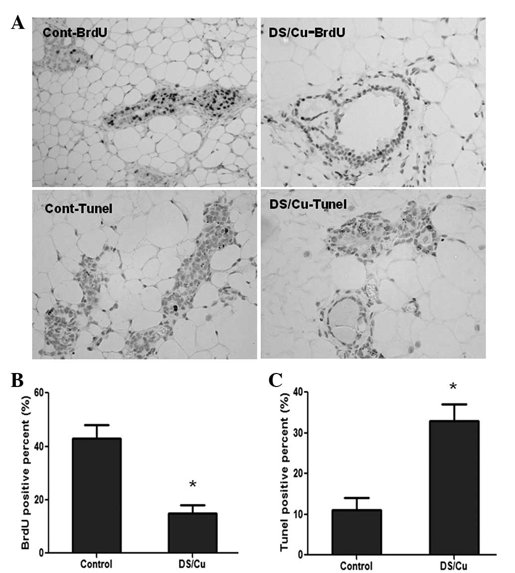 To verify this, the effect of DS/Cu was investigated in normal or malignant mammary cells in vitro and by measuring mammary gland development in vivo. Since proliferative and apoptotic promotion are the two mechanisms involved in tumor delay (28), alterations in cell proliferation and apoptosis were examined in the present study. As expected, significant growth inhibition and elevated apoptosis were observed in mammary gland tissue and breast cancer cells. Due to the fact that DS/Cu has no apparent effect on normal human mammary epithelial cells, the results suggested that DS/Cu may suppress mammary tumor development by the inhibition of cell proliferation and apoptotic activation of premalignant cells in the mammary gland. In agreement with this hypothesis, further experiments identified that mammary glands treated with DS/Cu displayed fewer premalignant lesions than those treated with the vehicle.