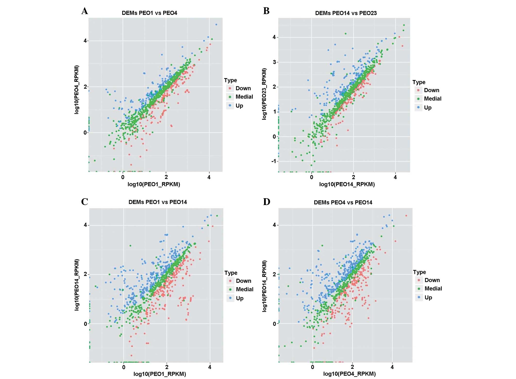 Bioinformatics protocols were applied to analyze the sequencing data. Firstly, sequencing data were mapped to marker sequences using bowtie (16) with a maximum of two mismatches in the read, at most three mismatches in a whole read, and only the best alignment reported of each read, while the rest parameters were left as default. Secondly, expression levels of markers were measured in reads per kilobase of transcript per million mapped reads (RPKM) (17). Only markers with an average RPKM value of three experimental duplicates ≥1 were defined as expressed markers. Thirdly, the DEMs of the four samples were detected referring to the method developed by Audic and Claverie (18). The P-values were adjusted using the Benjamin and Hochberg correction (19) in the R programming language. According to the criteria, expressed markers with fold change ≥1.5 and false discovery rate-adjusted P-value ≤0.01 were defined as differentially-expressed. Spearman’s coefficient was calculated to demonstrate the correlation between experimental duplicates (20).
