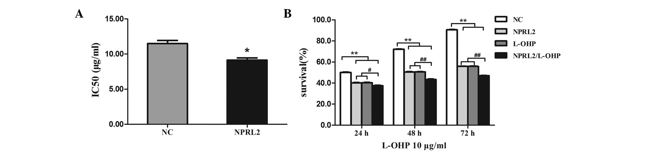 To investigate the role of NPRL2 in L-OHP-induced cytotoxicity, NPRL2 was transduced into HCT116 cells. The IC50 of L-OHP was lower in cells transduced with NPRL2 than in NC cells (P<0.05), indicating that overexpression of NPRL2 markedly increases the sensitivity of HCT116 cells to L-OHP (Fig. 2A). Cell survival was assayed following NPRL2 transduction and treatment with 10 μg/ml L-OHP for an additional 24, 48 and 72 h, which confirmed that the effects of NPRL2 on L-OHP sensitivity were time dependent (Fig. 2B).