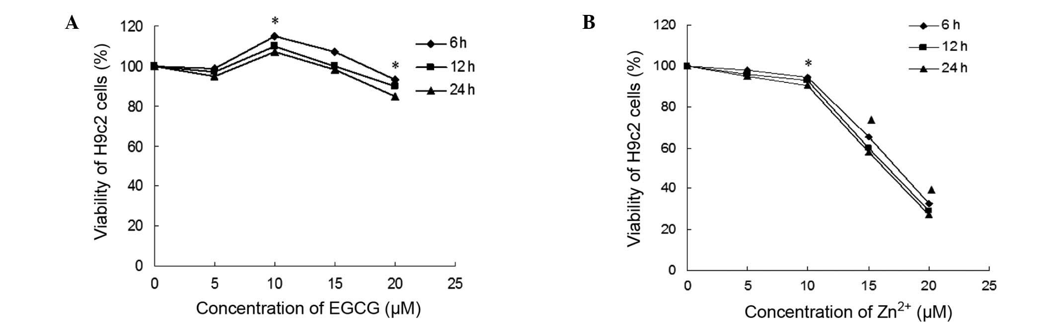 MTT assays were performed in order to determine the effects of EGCG and Zn2+ on the growth of H9c2 cells. Cells were plated in 96-well tissue culture plates and treated with varying doses of EGCG (0, 5, 10, 15 and 20 µM) or Zn2+ (0, 5, 10, 15 and 20 µM) for 6, 12 and 24 h at 37°C in an atmosphere containing 5% CO2 and 95% air. Following completion of the treatment, cells were washed with phosphate-buffered saline (PBS; Beyotime Institute of Biotechnology) and 50 µl MTT (5 mg/ml; Sigma-Aldrich) was added. The cells were subsequently incubated for 4 h at 37°C to allow for the formation of formazan precipitate, which was dissolved in dimethyl sulfoxide (Sigma-Aldrich). The absorbance at 490 nm in each well was then measured with a Multiskan Ascent ELISA reader (Thermo Fisher Scientific, Waltham, MA, USA). The cell viability was defined relative to that of the untreated control cells as follows: Cell viability = absorbance of treated sample/absorbance of control.