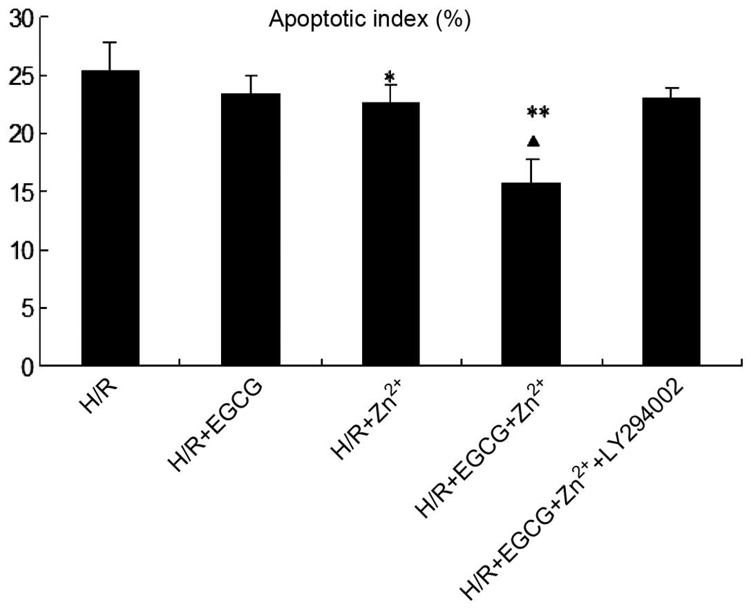 The Hoechst 33258 dye was able to diffuse through the intact membranes of H9c2 cells and stain their DNA, thus assessing the levels of apoptotic cell death. Apoptosis was confirmed by observing specific morphological alterations, including reduction in cell volume and nuclear chromatin condensation. Subsequent to staining, the H/R group was uniformly stained with a significant fluorescent signal, and demonstrated clear apoptotic morphology since the cells were condensed and contained fragmented chromatin in their nuclei (Fig. 4). To investigate whether EGCG and Zn2+ were cardio-protective, the number of apoptotic cells was determined and expressed as a percentage of the apoptotic index. The apoptotic index of H9c2 cells was determined as the percentage of apoptotic cells over the total number of cells counted, and a minimum of 500 cells were counted in each experiment (Fig. 5). Treatment with EGCG + Zn2+ significantly reduced the apototic index compared with that of the H/R group (P<0.01) and the H/R + Zn2+ group (P<0.01).