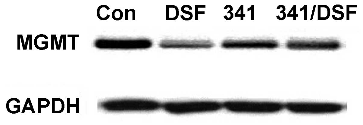 The effect of DSF on MGMT has been reported to be eliminated through inhibition of the ubiquitin (ub)-proteasomal route (20,31–34). To determine whether the enhancement of MGMT by DSF observed in the present study proceeded via the ubiquitin-proteasomal route, the proteasome inhibitor PS-341 was used. In accordance with a previous study by Paranjpe et al (20), the pituitary adenoma cells were pre-treated with PS-341 (10 µmol/l) for 6 h, followed by 50 µmol/l DSF for 12 h in the present study. Subsequent western blot analysis showed that DSF inhibited MGMT protein expression, while PS-341 pre-treatment attenuated the DSF-induced loss of MGMT protein expression (Fig. 6). These results suggested that the interference of DSF with MGMT expression proceeds via the ub-proteasomal route.