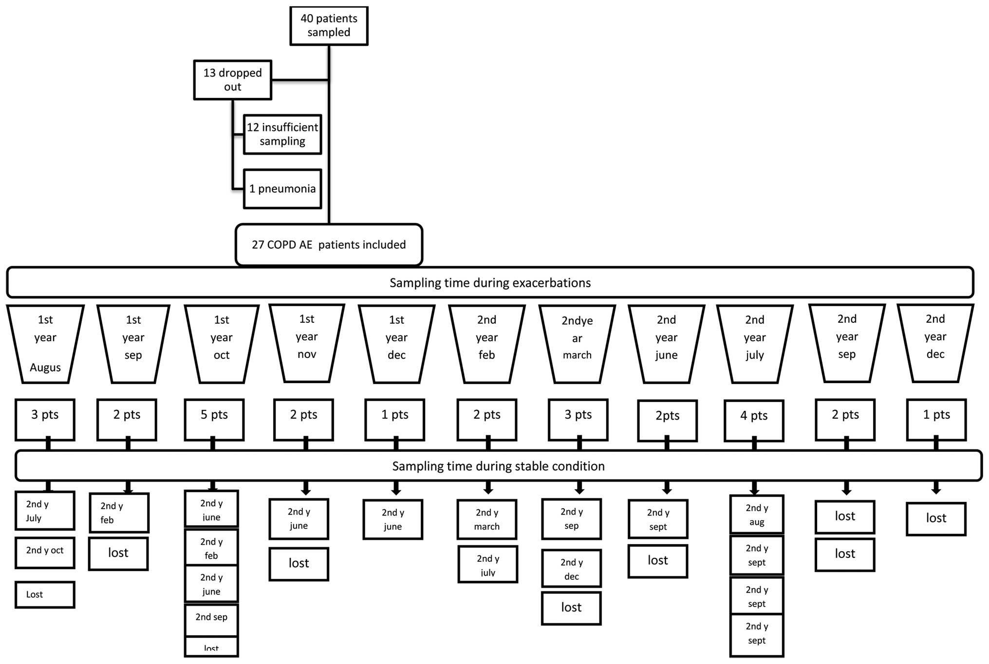 Forty patients with COPD-AE were assessed for 17 months beginning in August and lasting until December in the following year. Thirteen patiens were not included in the study (12 patients had insuffient sampling, 1 patient had pneumonia). Eighteen of the twenty seven patients were assessed during COPD-AE and whilst in a stable condition, and nine patients were not evaluated during stable condition. The study design and patient sampling time are provided in Fig. 1.