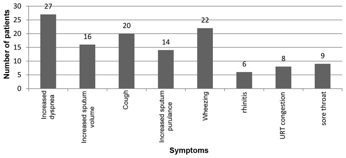 Twenty seven patients with moderate to very severe COPD were evaluated in the present study (Fig. 1). Demographic characteristics and results of the PFTs of the patients are summarized in Tables I and II. Patients had had a diagnosis of COPD for a mean of 6.33±5.75 years. The mean duration between visits was 181.66±113.87 (range, 30–420) days. Patients sought medical attention 6.96±9.81 times in the year prior to admission. The number of emergency room visits was 2.37±3.22. The number of patients who received inhaled steroid therapy was 19 (73.1%). Symptoms associated with AEs observed in patients with COPD-AE are presented in Fig. 2.