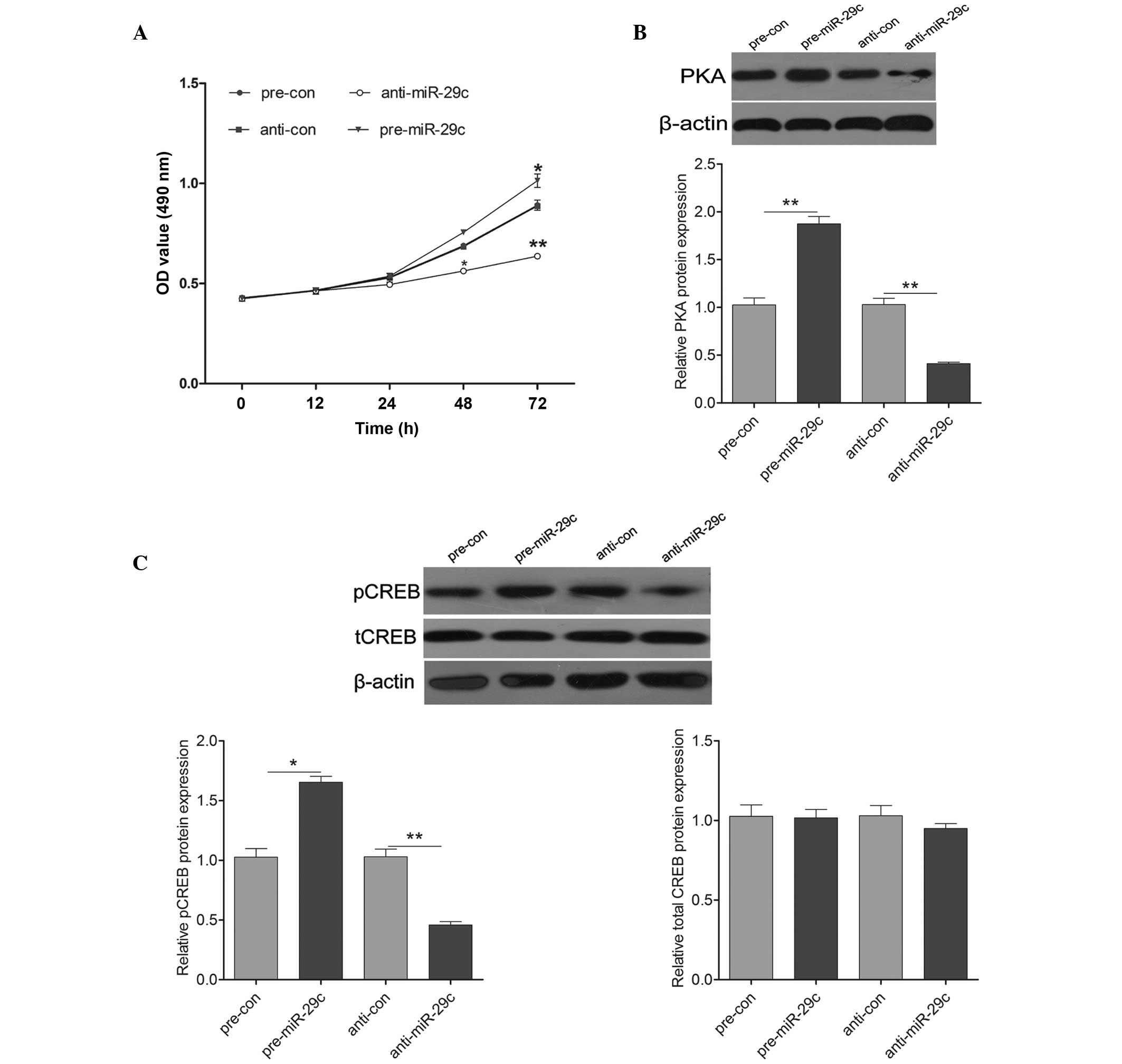 To determine whether miR-29c regulated hippocampal neuron proliferation, an MTT assay was performed by transfecting either pre-miR-29c or anti-miR-29c into the primary cultured hippocampal cells. Pre-miR-29c transfection exhibited a significant promotion of cell proliferation, compared with the control cells, whereas transfection with anti-miR-29c led to a significant inhibition on cell proliferation (Fig. 3A). To further investigate the molecular mechanism underlying miR-29c induction on cell growth, the expression levels of molecules associated with PKA signaling were detected. As shown in Fig. 3B, the protein expression of PKA was increased by the upregulation of miR-29c and decreased by the downregulation of miR-29c. Additionally, the expression of pCREB was induced significantly following transfection with pre-miR-29c, and was reduced following transfection with anti-miR-29c (Fig. 3C). These results suggested that miR-29c promoted hippocampal neuron cell proliferation by activating PKA signaling.