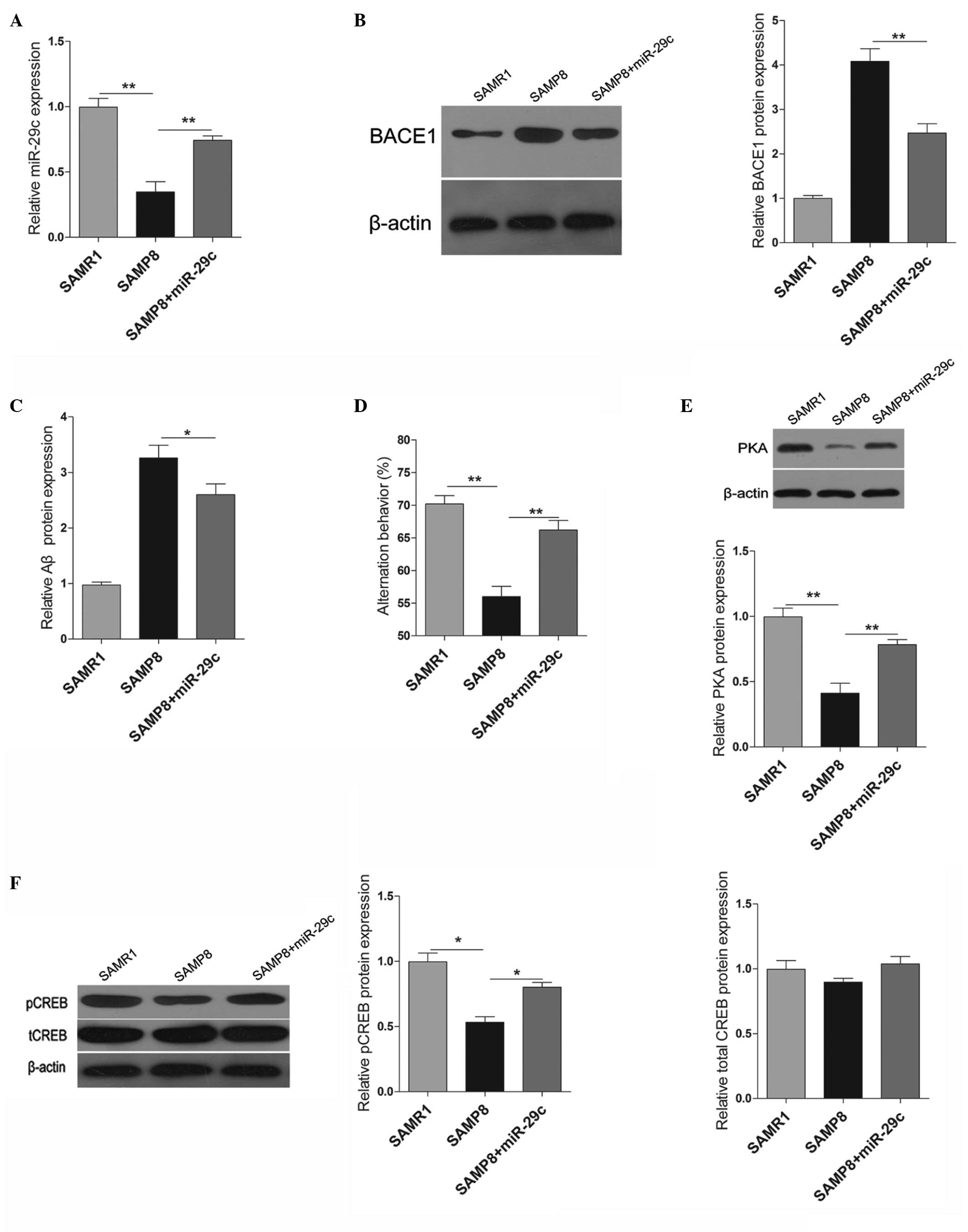 In conclusion, the results of the present study suggested that miR-29c, as a peripheral AD biomarker, promoted learning and memory behaviors in SAMP8 mice, which was associated with a decrease in the production of Aβ by targeting BACE1 and increasing the activity of PKA/CREB involved in neuro-protection. Therefore, miR-29c may be a promising potential therapeutic target against AD.