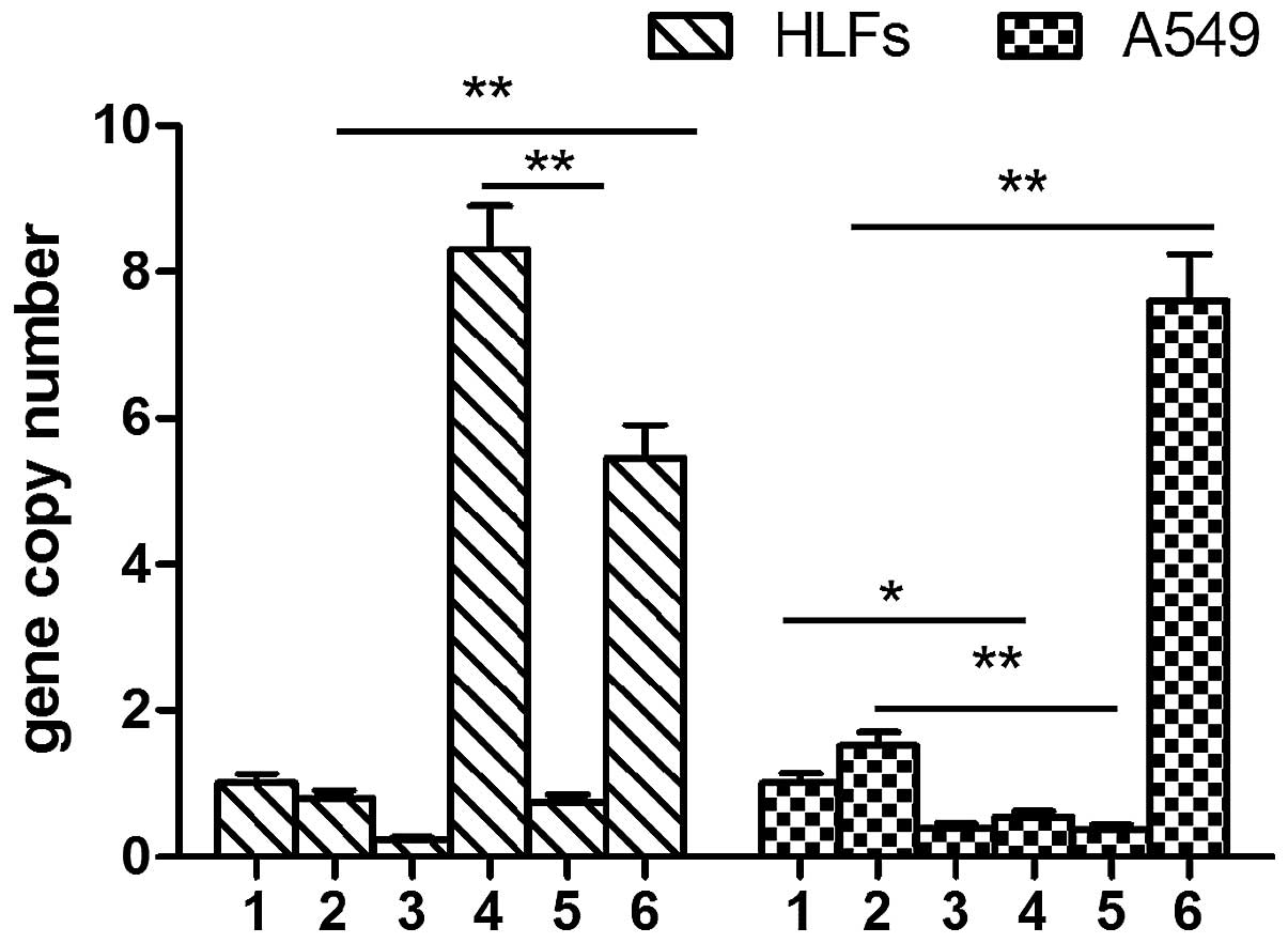 To examine the effects of the SOCS1 gene on the expression levels of MMPs/TIMPs, the A549 cells and HLFs were randomized into six groups: Cells left untreated; cells stimulated with transforming growth factor-β1 (TGF-β1; R&D Systems, Minneapolis, MN, USA) (2 ng/ml) alone; cells transfected with negative lentiviral plasmid and stimulated with TGF-β1 (2 ng/ml); cells transfected with a lentiviral plasmid overexpressing SOCS1 and stimulated with TGF-β1 (2 ng/ml); cells transfected with a lentiviral plasmid interfering with SOCS1 expression and stimulated with TGF-β1 (2 ng/ml); and cells treated with TGF-β1 (2 ng/ml) and dexamethasone (DXM; 10−6 M; Biovision, San Francisco, CA, USA). All of the cells were stimulated for ≥72 h. Quantitative PCR was used to detect the mRNA expression levels of MMP-1, MMP-2, MMP-9, TIMP-1, TIMP-2 and TIMP-4. The primer sequences for the PCR are listed in Table I. PCR was performed with a 7500 Fast Real-Time PCR System (Applied Biosystems Life Technologies, Foster City, CA, USA) with FastStart Universal SYBR Green (Roche Diagnostics, Basel, Switzerland) following cDNA synthesis. PCR conditions were as follows: Initial denaturation at 95°C for 10 min, followed by 40 cycles of amplification at 95°C for 15 sec and 60°C for 60 sec. Fold-change in the gene expression levels were calculated using the 2−ΔΔCt method relative to the internal reference gene GAPDH.