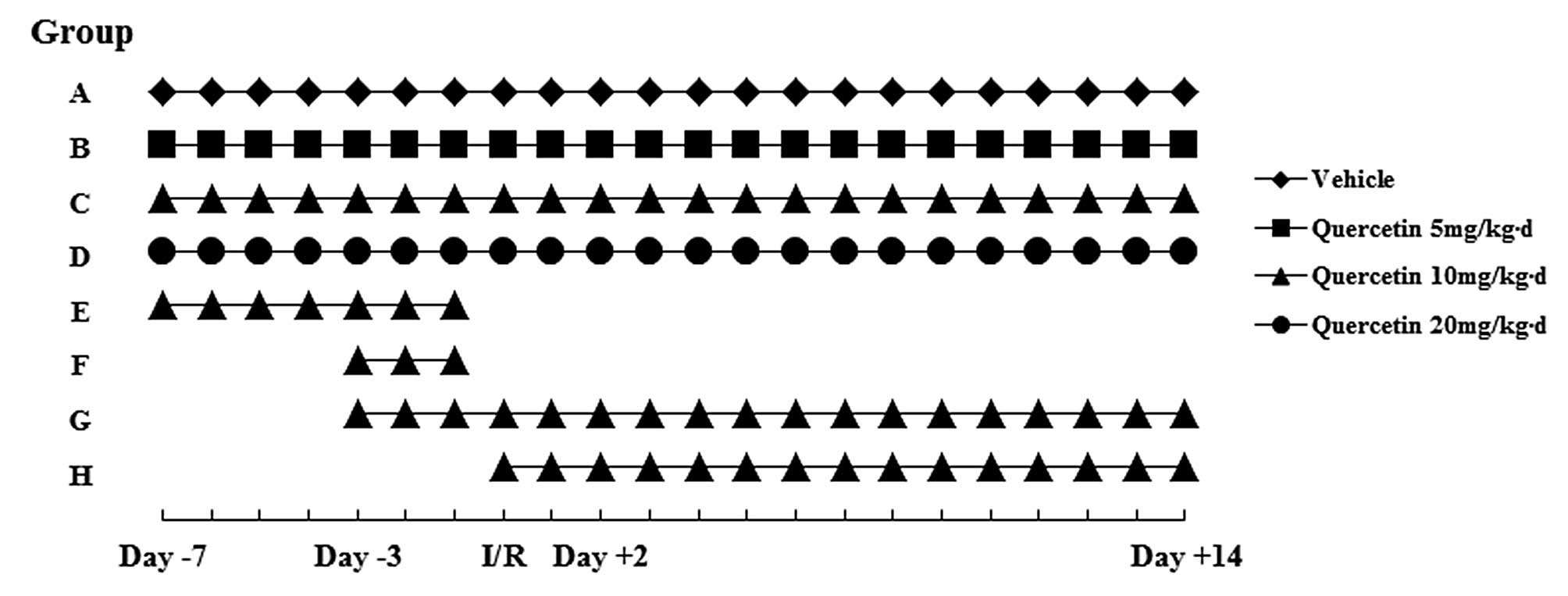 Quercetin (≥95%) was purchased from Sigma-Aldrich (St. Louis, MO, USA). Quercetin powder was dissolved in distilled water, and was stored at a final concentration of 1 g/ml. The solution was administered by oral gavage to the SD rats. Rats in the sham + vehicle group were given an equivalent volume of vehicle (distilled water, 10 ml/kg, orally (p.o.); once daily). Volumes of drug solution required for the administration of 5, 10 or 20 mg/kg/day quercetin equated to 3 ml for a 300-g rat, which is an acceptable volume for oral gavage.