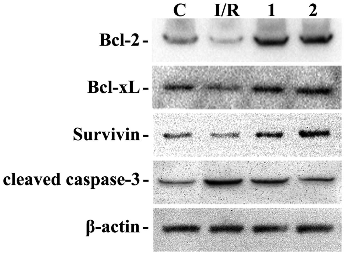 At 24 h following I/R injury, rats were intraperitoneally anesthetized and sacrificed by cervical dislocation to obtain the brain. Brain tissues (comprising the cortex and striatum) were collected and stored at −80°C. Tissues were harvested and resuspended in lysis buffer, washed with ice-cold PBS and lysed in extraction buffer, containing 40 mmol/l Tris-HCl (pH 7.5), 150 mmol/l KCl, 1 mmol/l EDTA, 1% Triton X-100, 100 mmol/l NaVO3, 1 mmol/l PMSF, supplemented with the protease inhibitor cocktail (Roche, Basel, Switzerland). The protein (50 µg) was separated on 10% SDS-PAGE gels and transferred onto nitrocellulose membranes. The membranes were blocked with 5% non-fat milk in Tris-buffered saline (TBS) at 37°C. Rabbit anti-Bcl-2 polyclonal antibody (1:1,000; Cell Signaling Technology, Danvers, MA, USA; cat no. 2876), rabbit anti-Bcl-xL polyclonal antibody (1:1,000; Cell Signaling Technology, cat no. 2762), rabbit anti-Bad monoclonal antibody (1:1,000; Cell Signaling Technology, Danvers, MA, USA, cat no. 9293), rabbit phospho (p-)Bad (Ser136) monoclonal antibody (1:1,000; Cell Signaling Technology, Danvers, MA, USA, cat no. 4366), rabbit anti-survivin polyclonal antibody (1:1,000; Cell Signaling Technology, Danvers, MA, USA, cat no. 2803), rabbit anti-Akt polyclonal antibody (1:1,000; Cell Signaling Technology, Danvers, MA, USA, cat no. 9272), rabbit anti-p-Akt (Ser473) monoclonal antibody (1:1,000; Cell Signaling Technology, Danvers, MA, USA, cat no. 4060), and rabbit anti-β-actin monoclonal antibody (1:1,000; Cell Signaling Technology, Danvers, MA, USA, cat no. 4967) were diluted in freshly prepared PBS containing 3% skimmed milk powder, and blots were incubated in primary antibodies at 4°C overnight. Horseradish peroxidase-linked goat anti-rabbit IgG antibody (1:5,000; Beijing Biosynthesis Biotechnology Co., Ltd. Beijing, Cihna; cat. no. bs-0295G-HRP) was used as a secondary antibody in TBS containing 5% non-fat milk and the blots were incubated for 3 h at room temperature. Antigen-antibody complexes were detected using an enhanced chemiluminescence kit (ECL Plus; GE Healthcare Life Sciences, Chalfont, UK), and bands were analyzed using ImageJ version 1.42q software (National Institutes of Health, Bethesda, MD, USA).