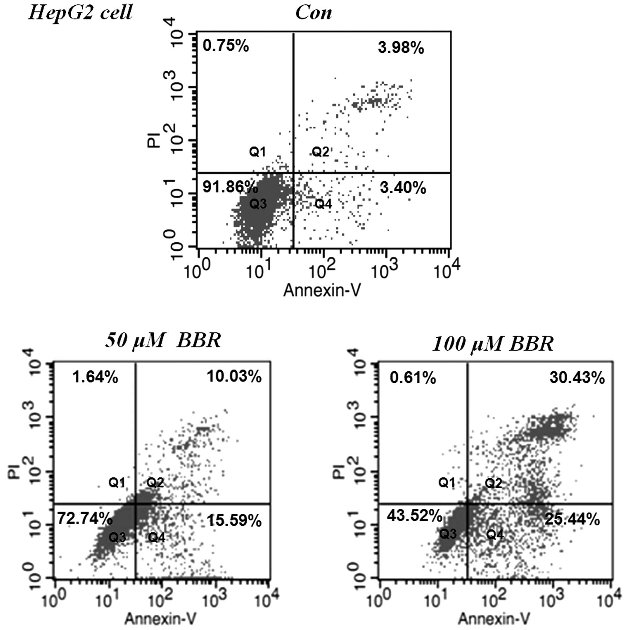 Cell death and apoptosis were detected using an Annexin V-FITC Apoptotic Detection kit by flow cytometry (BD Biosciences, Franklin Lakes, NJ, USA). In brief, following treatment with 0, 50 and 100 µM BBR at 37°C for 24 h, the HepG2 cells plated in six-well plates at a density of 5×106 cells/well were harvested and washed twice with cold phosphate-buffered saline. Following this, the cell pellets were suspended with binding buffer (Beyotime Institute of Biotechnology) at a density of 1×l06 cells/ml. Following the addition of 5 µl FITC-conjugated annexin V to the suspension, the suspension was incubated for 15 min at 4°C in the dark, followed by the addition of 5 µl prop-idium iodide (PI; Beyotime Institute of Biotechnology) for 5 min. The samples were subsequently analyzed using flow cytometry (BD FACSCalibur; BD Biosciences).