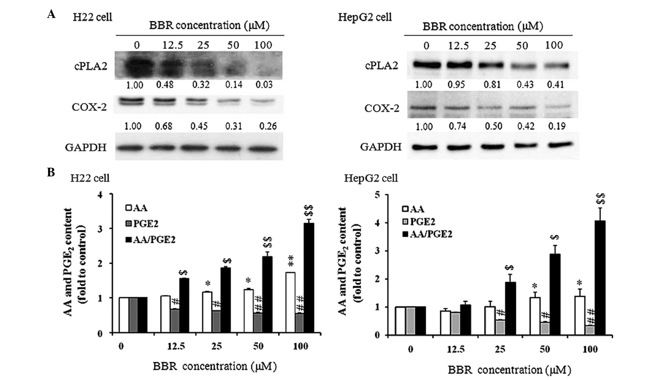 To investigate how BBR affects the AA metabolic pathway, two key enzymes (cPLA2 and COX-2) in the pathway were assessed using western blot analysis. As shown in Fig. 4A, the protein expression levels of cPLA2 and COX-2 were suppressed significantly in a dose-dependent manner between concentrations of 12.5–100 µM BBR in the H22 and HepG2 cells. The contents of AA and PGE2 in the culture medium of the H22 and HepG2 cells treated with BBR for 24 h were then measured. As shown in Fig. 4B, the content of AA was significantly increased, and increased as the dose of BBR increased. The level of PGE2 was significantly reduced, even with treated with a low dose of BBR (12.5 µM). The concentration ratio of AA to PGE2 was increased following BBR treatment in the H22 and HepG2 cells, suggesting that the ratio may be important in BBR-induced apoptosis in the tumor cells.