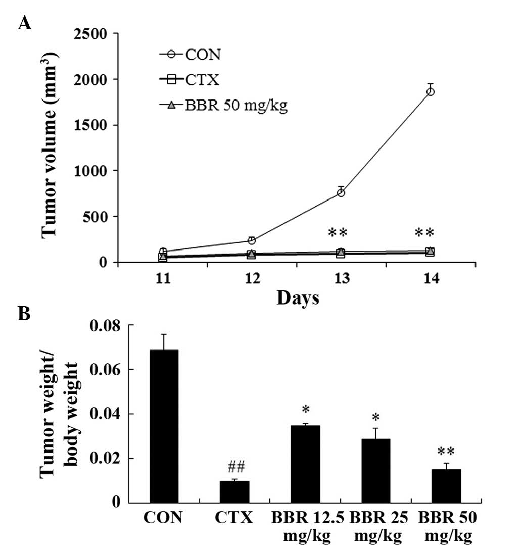 To evaluate the efficacy of BBR on tumor growth in vivo, a H22 transplanted tumor model was established in BALB/c mice. As shown in Fig. 5A, the tumor volume in the control group reached the logarithmic growth phase 12 days following inoculation, and the same inhibitory effects were observed in the 50 mg/kg BBR and the CTX positive control group. Treatment with BBR reduced tumor volume in a dose-dependent matter (Fig. 5A), and this was confirmed by the ratios of tumor weight relative to mouse body weight (Fig. 5B).