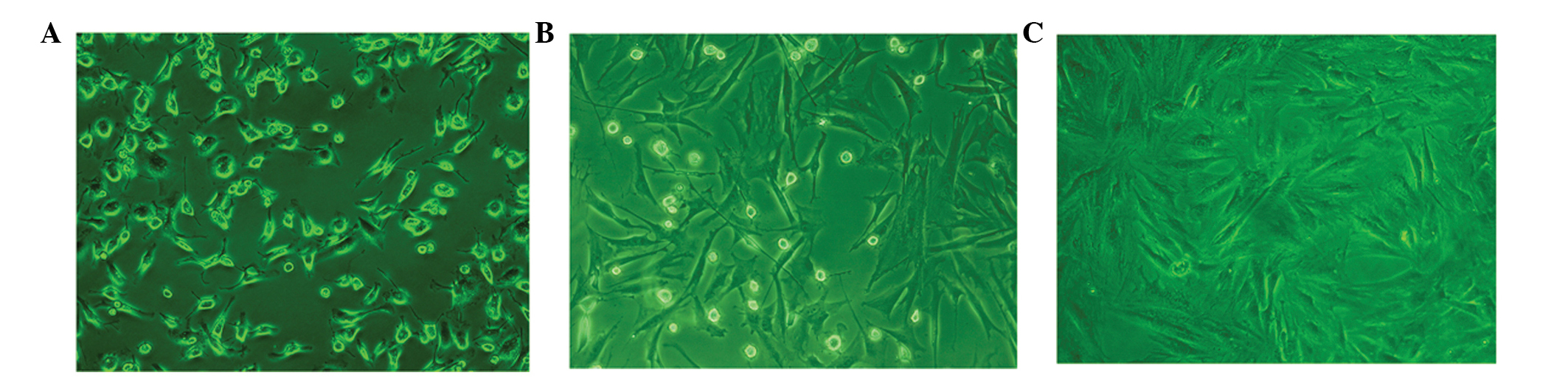 Advances in molecular biology have coalesced with an improved understanding of craniofacial biology to enable what has been termed generative craniofacial surgery (11) Due to various advantages, the use of BMSCs as seeding cells is widespread in investigations of gene therapy, cell substitution therapy and tissue engineering (12–14). In the present study, BMSCs were successfully isolated and purified from an SD rat, based on the combination of morphological characteristics and flow cytometeric analysis using a BMSC-specific marker. This provided an experimental basis for the subsequent experiments.
