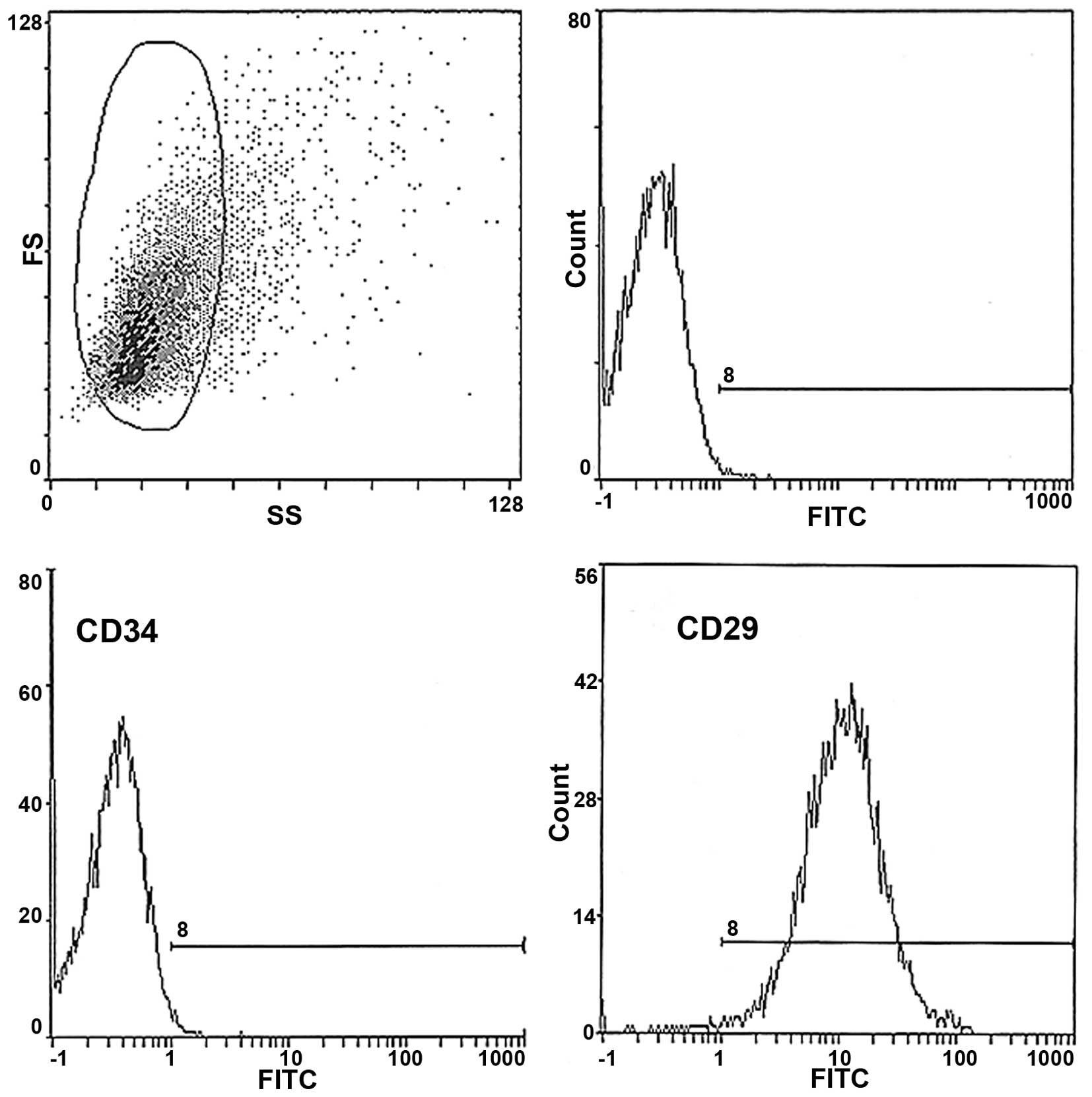 The BMSCs were spherical in shape shortly following seeding, the majority of which were suspended in the medium. After 48 h, the majority became adherent and exhibited a different morphology, predominantly spindle-shaped or polygonal. The nuclei were usually large and located in the middle or margin of the cells. Scattered adherent fibroblast-like cells were observed on the 3rd day of culture, following which the passaged cells became completely adherent within 24 h. The shape of the spindle in the P3 cells was consistent. Following subculture for >20 generations, the cells maintained vigorous growth and amplification, and no obvious difference in the duration required to reach confluence were observed (Fig. 1). In addition, the biomarkers of BMSCs were characterized using flow cytometry (Fig. 2), which revealed >85% of the expanded P3 BMSCs were positive for the surface biomarker of CD29, characteristic of BMSCs. In addition few hematopoietic cells were observed, as indicated by the low level of CD34-expressing cells. These results indicated that the P3 cells were highly purified BMSCs.