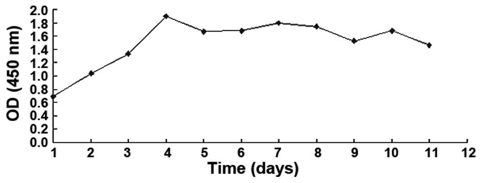 The growth curve, which was produced according to the OD values of each well (Fig. 3), demonstrated that the BMSCs of regular seeding density had approximately the same growth circle. In the first 2–3 days following seeding, the cells grew relatively slowly, exhibiting a delayed growth phrase. Consequently, the cells then grew rapidly to reach the logarithmic growth phrase. On days 7–8, the total number of cells reached the highest value. Subsequent to the following growth plateau, the rate of cell growth slowed.