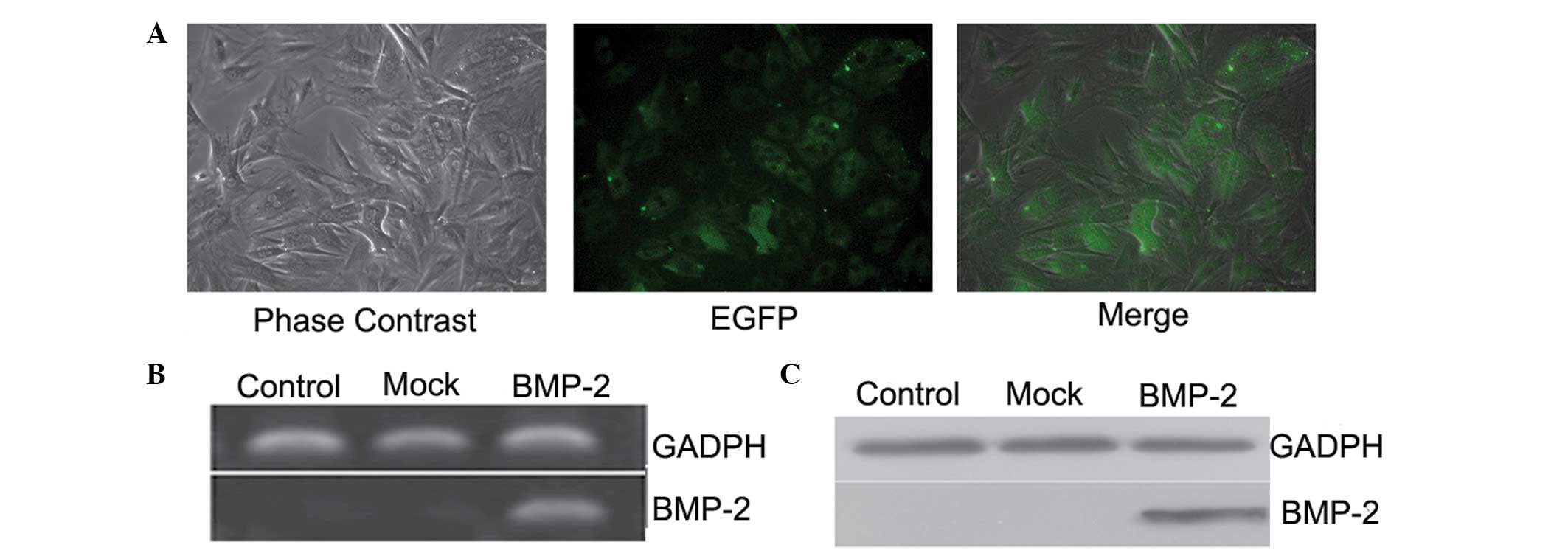 Overexpression of BMP-2 in the BMSCs was induced using lentiviral particles containing a construct, which encoded EGFP. At 72 h post-transduction, green fluorescence was detected throughout the cytoplasm, in which the transduction efficiency was >90% (Fig. 4A). The RT-qPCR analysis demonstrated that, compared with the mock and control cell groups, the mRNA (Fig. 4B) and protein (Fig. 4C) levels of BMP-2 were significantly increased in the BMP-2-transduced BMSCs, which further confirmed that BMP-2, the target gene, had been successfully transduced into the BMSCs and was expressed efficiently in the cells.