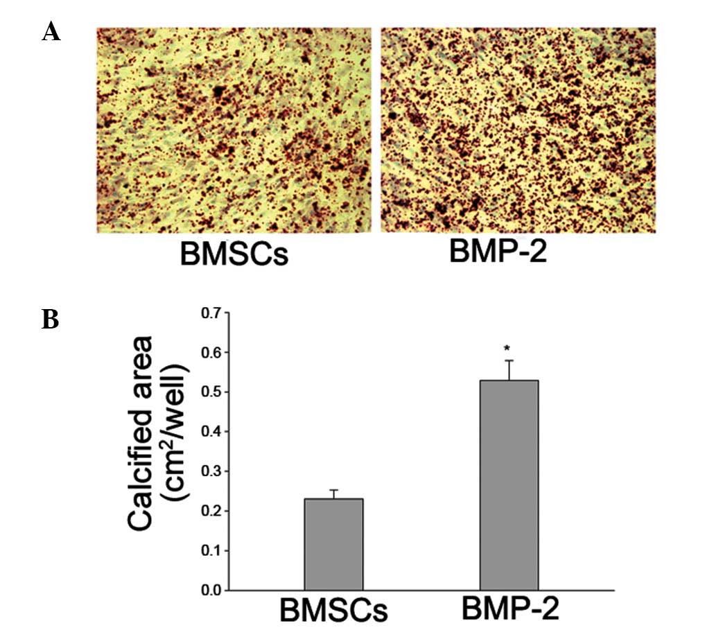 The BMSCs with or without BMP-2 were dissociated and passaged using 0.25% trypsin (Sigma-Aldrich) to produce adherent cell slices. When the cells reached confluence at 80% on the cover slips, the medium was substituted with osteogenetic induction solution (Shanghai Sangon Biotech, Co., Ltd., Shanghai, China) containing 0.1 µmol/l dexamethasone, 50 mg/l ascorbic acid and 10 mmol/l β-glycerophosphate, and cultured at 37°C and 5% CO2. The medium was replaced every 3 days. On the 21st day, the cells were fixed with 95% ethanol for 10 min, and incubated in 2% Alizarin red staining solution (Sigma-Aldrich) for 5 min. The staining reactions were terminated by washing the cells with PBS. Calcification deposits were identified in the matrix, which appeared bright red under light microscopy (Olympus CX23; Olympus) and images of the cells were captured. The calcification was quantified by determining the densities and areas of Alizarin red staining using an image analysis program (Multi Gauge V3.0 software; Fujifilm, Tokyo, Japan).