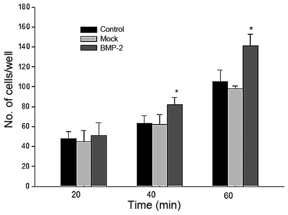 As it is understood that the growth and differentiation of several types of cell, particularly stem cells, is regulated by cell-cell and cell-matrix interactions (10), the adhesive ability of the BMP-2-infected BMSCs was evaluated. The result of the adherence assay revealed that the adhesive ability of the BMSCs significantly improved with time following BMP-2 transduction (Fig. 7).