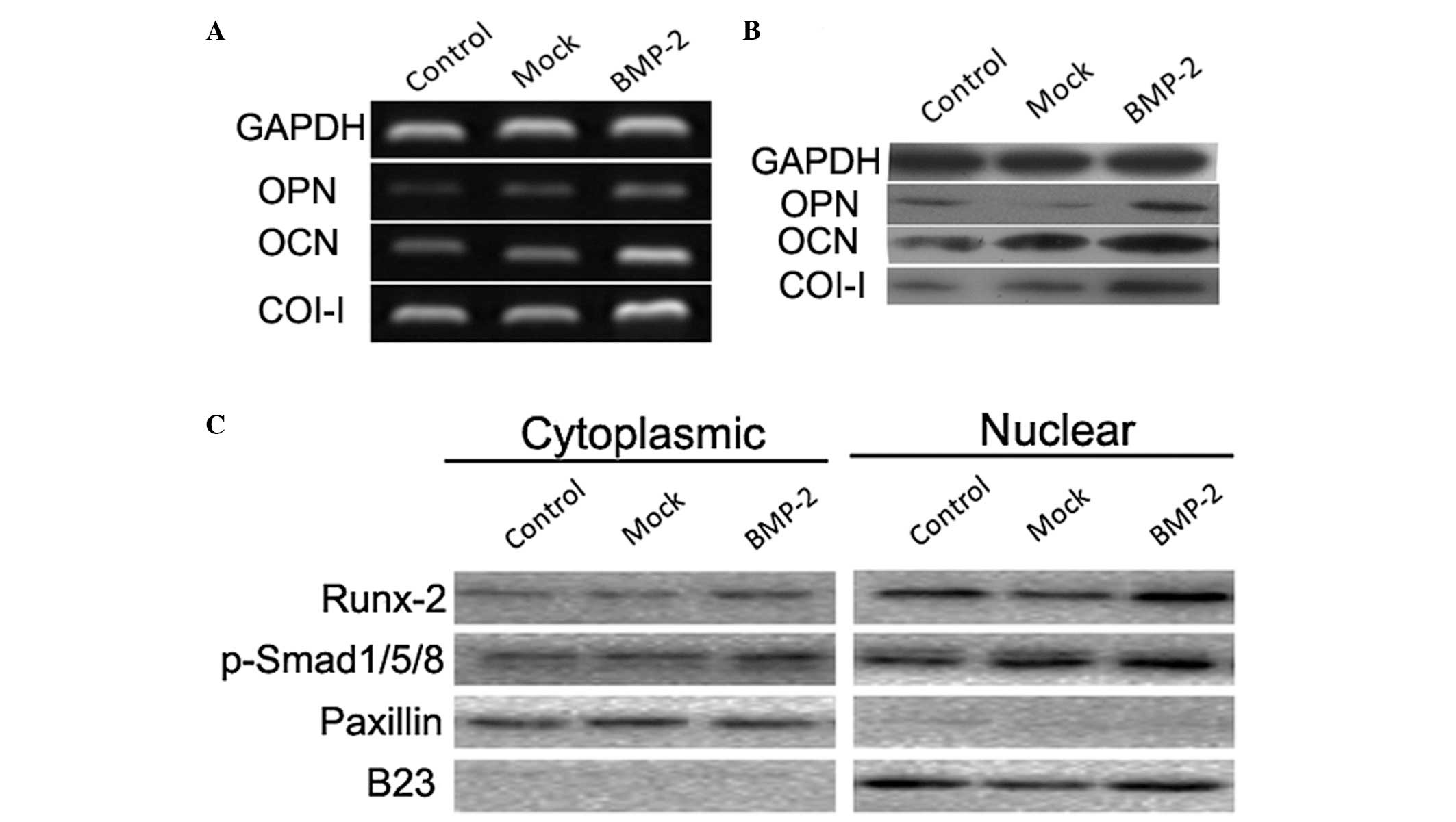 The mRNA and protein levels of OPN, OCN and Col-I in the BMSCs were significantly higher in the BMP-2 group, compared with those in the mock and control groups (Fig. 8A and B). In addition, western blot analysis of the cytoplasmic and nuclear fractions demonstrated that the nuclear accumulations of Runx-2 and p-Smads1/5/8 were significantly increased following BMP-2 transduction into the BMSCs, compared with the control and mock cells (Fig. 8C).
