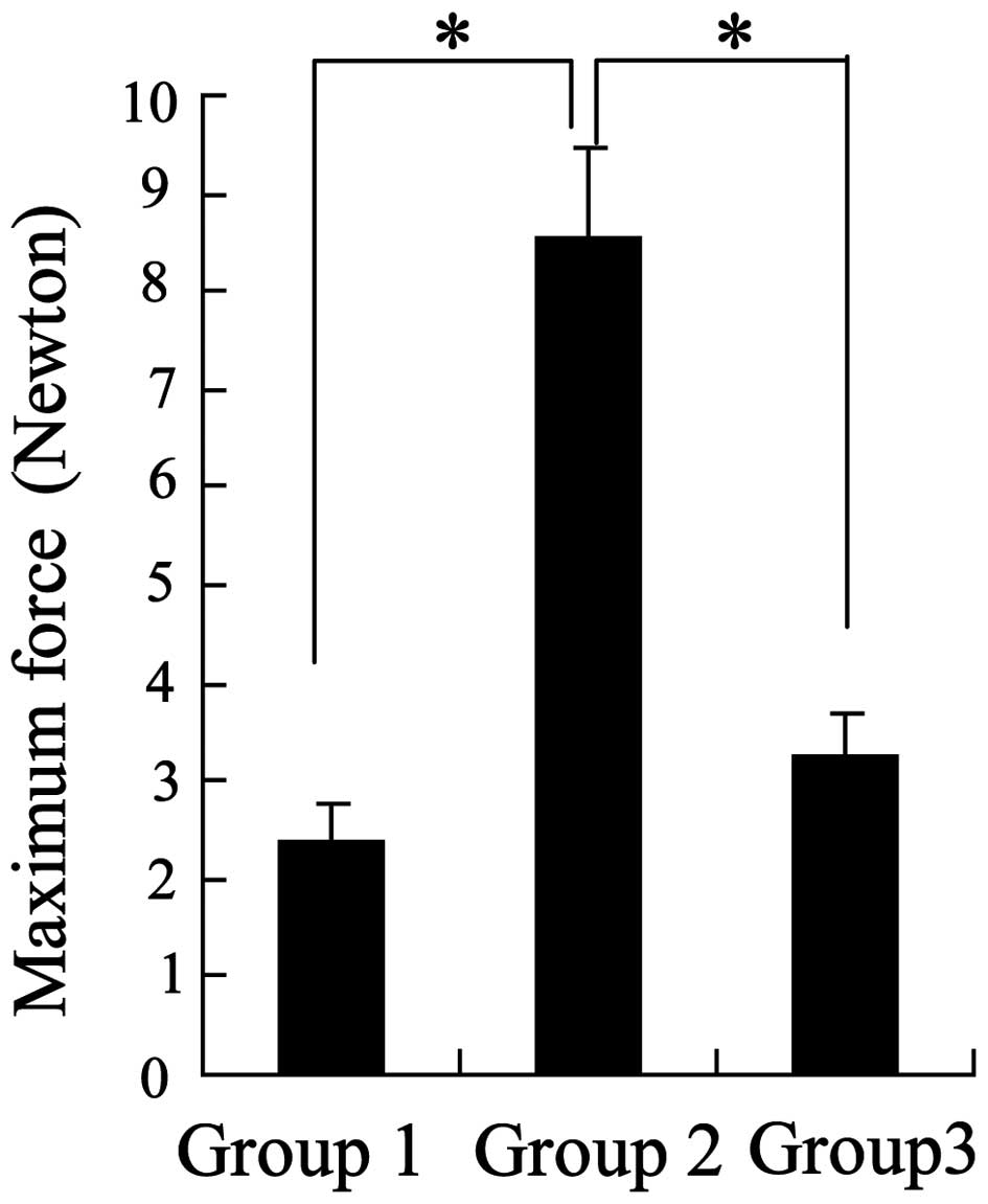 Following surgery, the flexor tendons were harvested from the rabbits, in order to determine the state of adhesion. Based on the gross (10) and histological evaluations of adhesion (Table I), the numbers of rabbits exhibiting severe and moderate levels of adhesion werelowest in the chitosan-treated rabbits (group 2; 0 severe and 2 moderate; n=10), when compared with the levels in the normal saline-treated rabbits (group 1; 6 severe and 3 moderate; n=10), and the effect of chitosan was reversed following nicotinamide treatment (group 3; 5 severe and 3 moderate; n=10). Furthermore, analysis of the maximum force generated by the tendon anastomoses demonstrated that the greatest forces were observed in the chitosan group (Fig. 1). These results indicated that chitosan may possess anti-adhesive bioactivity.