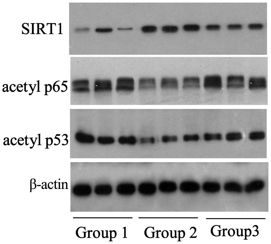 In addition to examination of the physiological adhesion status, the flexor tendons were randomly selected and disrupted using liquid nitrogen, in order to detect the expression levels of specific signaling molecules. As shown in Fig. 2, the expression levels of SIRT1 in the chitosan group (group 2; n=3/group) were elevated, when compared with the control group; chitosan-induced SIRT1 protein expression was observed to be inhibited by nicotinamide. Conversely, the expression levels of the SIRT1-targeted proteins, acetylated p65 and p53, decreased with the upregulation of SIRT1 and increased with the downregulation of SIRT1, which was induced by nicotinamide.