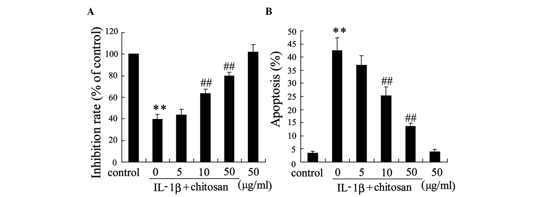 An in vitro experiment was performed in human tenocytes to further ascertain the protective effects of chitosan on tendon repair. Following chitosan pretreatment, the tenocytes were incubated with IL-1β. Fig. 3 demonstrates that chitosan influenced the survival of tenocytes. Treatment with 10 µg/ml or 50 µg/ml chitosan attenuated IL-1β-induced cell proliferation (Fig. 3A) and apoptosis (Fig. 3B) in a dose-dependent manner, compared with the IL-1β group.