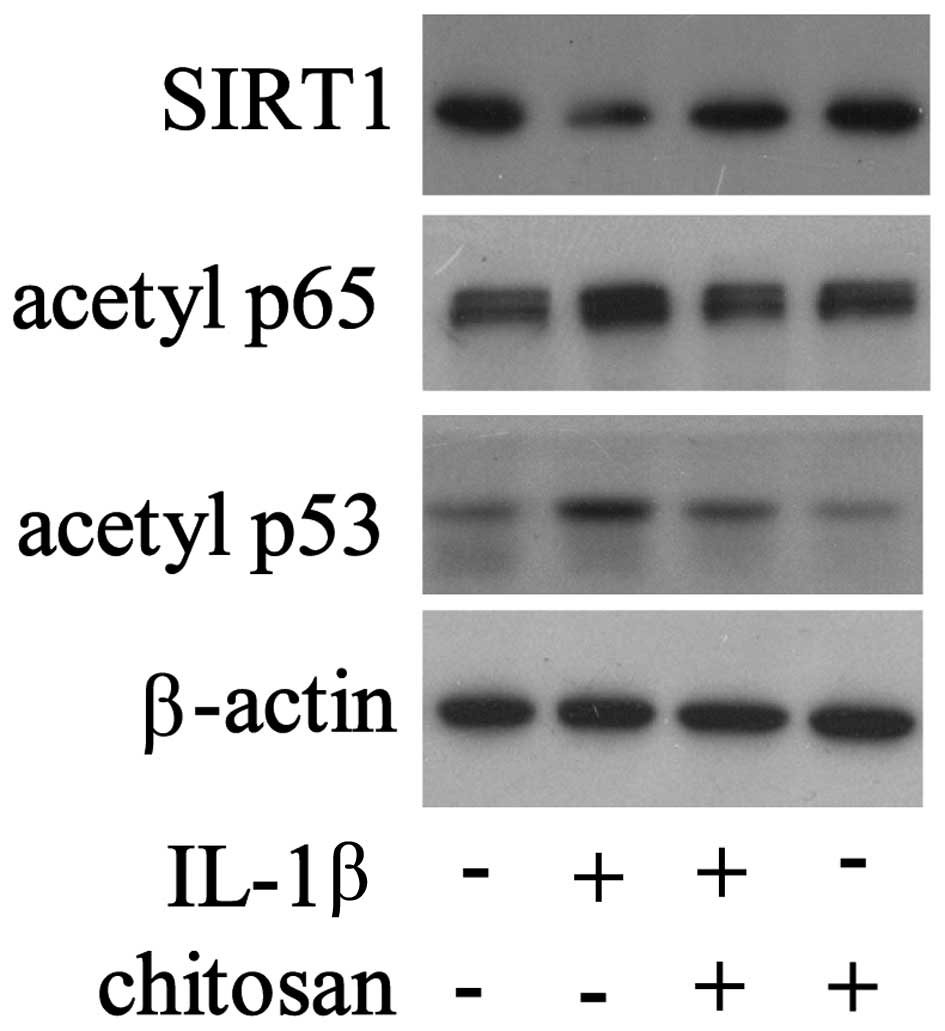 Following chitosan pretreatment, the cells were exposed to IL-1β, and the expression levels of various signaling molecules were detected. As shown in Fig. 4, the expression levels of SIRT1 were downregulated and the expression levels of acetylated p65 and p53 were upregulated in the tenocytes stimulated with IL-1β. However, chitosan reversed the changes in protein expression that had been induced by IL-1β. These results demonstrate the fundamental regulatory role of SIRT1 in tendon repair by chitosan.