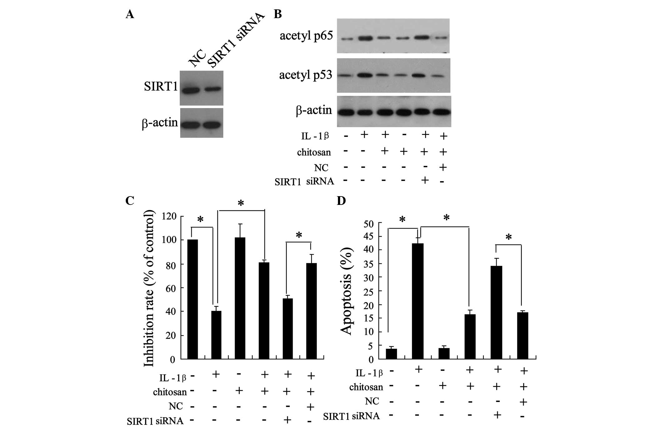 Nuclear factor (NF)-κB is a nuclear transcription factor, which has been reported to regulate the gene expression of numerous proinflammatory proteins (17). The present study demonstrated that chitosan reversed proinflammatory IL-1β-induced upregulation of acetylated p65 (a subunit of NF-κB) and upregulated SIRT1. It has previously been reported that deacetylation of NF-κB subunit p65 may lead to a decrease in NF-κB transcriptional activity, thereby resulting in cell apoptosis (17,25). In this context the results of the present study indicated that knockdown of SIRT1 abrogated the inhibitory effects of chitosan on IL-1β-induced p65 acetylation and apoptosis. These results indicate that chitosan may inhibit inflammation-associated NF-κB activation via SIRT1 signaling during adhesion repair.