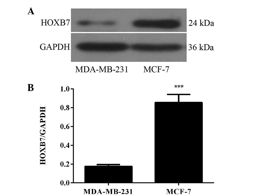 To detect whether the protein expression level of HOXB7 was in accordance with the results of the mRNA expression level in breast cancer cells, western blotting was used in the same two human breast cancer cell lines, namely MDA-MB-231 and MCF-7 cells. The results of the western blotting revealed that HOXB7 protein was also overexpressed in MDA-MB-231 and MCF-7 breast cancer cell lines and the expression level in MCF-7 breast cancer cells was significantly higher compared with that in MDA-231 breast cancer cells (***P<0.001; Fig. 2). Therefore, combined with the result in Fig. 1, the MCF-7 human breast cancer cell line was selected for further experiments.