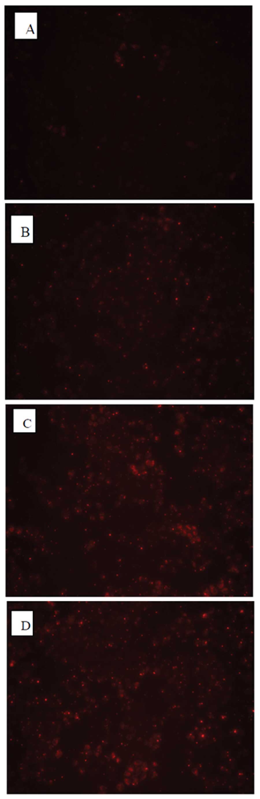 To optimize conditions of transfection, three different concentrations of HOXB7-siRNA-NC-CY3 (fluorescent negative control) were transfected into MCF-7 breast cancer cells. As shown in Fig. 3, all MCF-7 cells transfected with HOXB7-siRNA for 4–6 h exhibited red fluorescence under a fluorescence microscope. It was observed that the untransfected MCF-7 exhibited no red fluorescence (Fig. 3A) and the MCF-7 cells transfected with 0.1 μM siRNA demonstrated a little red fluorescence (Fig. 3B). By contrast, ~80% infected cells exhibited red fluorescence at an siRNA concentration of 0.2 μM as shown in Fig. 3C, while 90% exhibited red fluorescence at an siRNA concentration of 0.4 μM as shown in Fig. 3D, suggesting successful transfection. Thus, the concentration of 0.4 μM siRNA that exhibited the highest transfection efficiency was selected for the following experiments.
