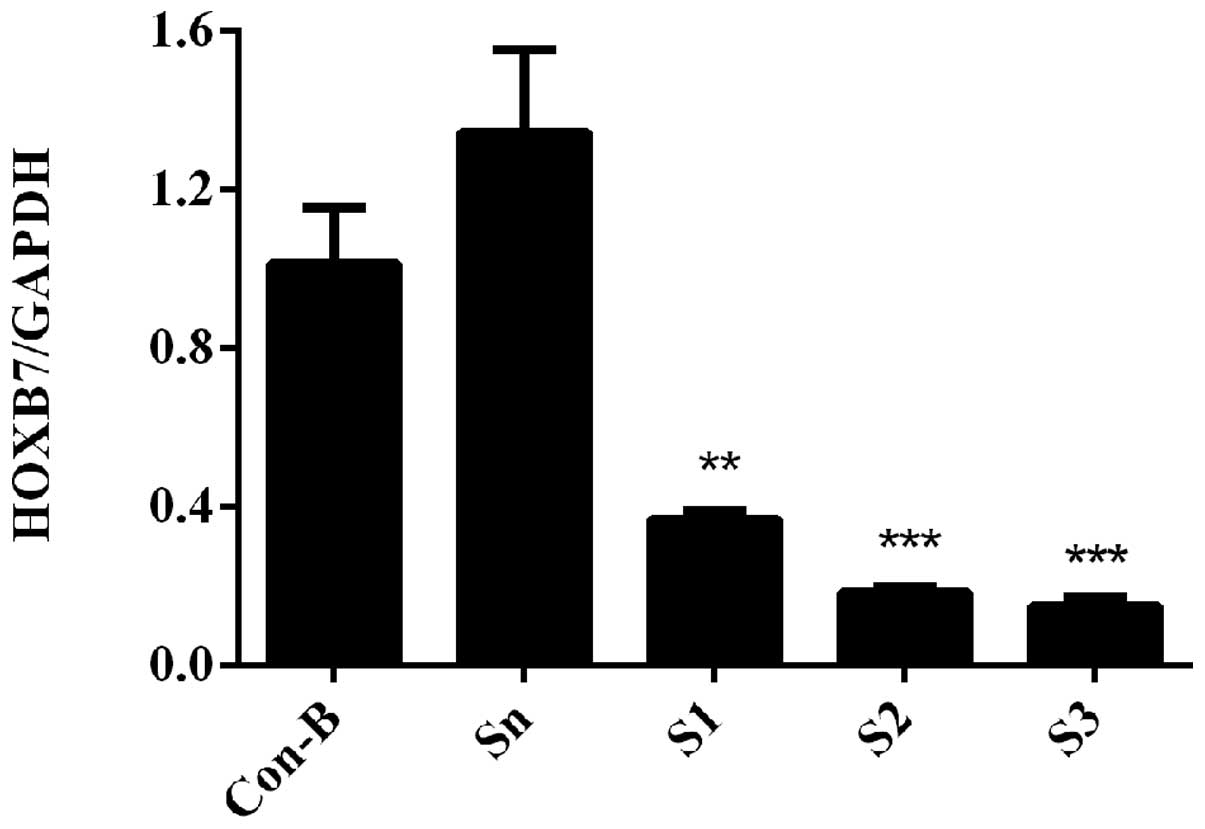 To determine the interference efficiency of HOXB7-siRNA on MCF-7 cells, RT-qPCR was used following transfection for 48 h. The results demonstrated that HOXB7 mRNA was overexpressed in Con-B and Sn groups following transfection and no clear difference was observed in the two groups (P>0.05). However, the mRNA expression levels of HOXB7 in the S1, S2 and S3 groups were significantly downregulated compared with the Con-B and Sn groups with interference efficiencies of 63.38±0.02, 81.53±0.01 and 84.87±0.02%, respectively. The differences were statistically significant (**P<0.01 and ***P<0.001; Fig. 4). The mRNA expression level of HOXB7 was the lowest in the S3 group and differed markedly from that in the Con-B and Sn groups (***P<0.001; Fig. 4).