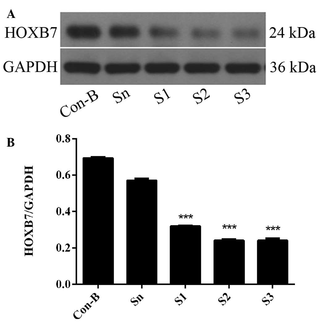 To further determine the interference efficiency of HOXB7-siRNA on MCF-7 cells, western blotting was used following transfection for 72 h. The results demonstrated that HOXB7 protein was overexpressed in the Con-B and Sn groups following transfection and no differences were observed between the two groups (P>0.05). However, the expression of HOXB7 protein in the S1, S2 and S3 groups was significantly downregulated compared with the Con-B and Sn groups with interference efficiencies of 53.88±0.0001, 65.22±0.004 and 65.25±0.001%, respectively. The differences were all statistically significant (***P<0.001; Fig. 5). The HOXB7 protein expression level was the lowest in the S3 group and differed markedly from that in the Con-B and Sn groups (***P<0.001; Fig. 5). Combined with the result in Fig. 4, S3 had the maximum inhibition efficiency of HOXB7 and therefore S3 was used in the following experiments.