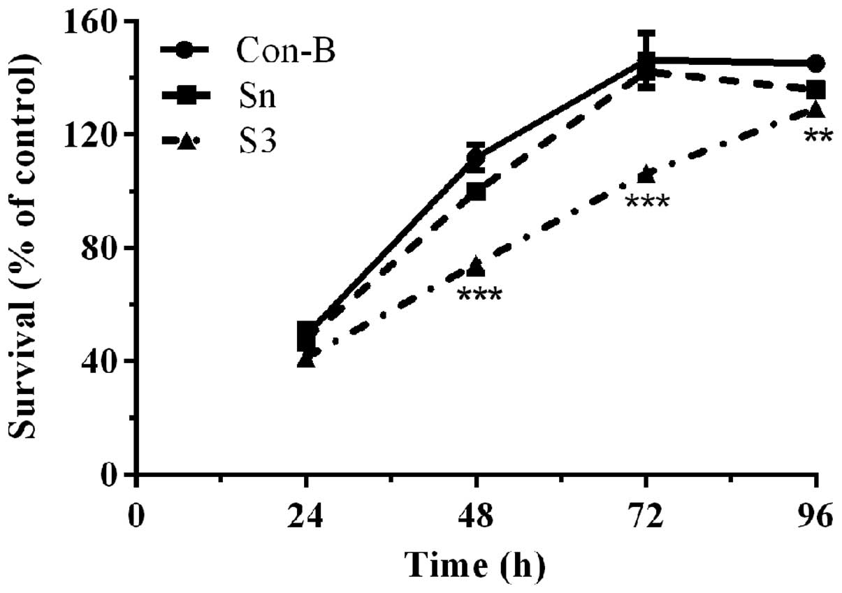 To determine the effect of HOXB7-S3 on cell proliferation in MCF-7 breast cancer cells, a CCK-8 assay was used. As shown in Fig. 6, the cell viability of the three groups demonstrated no significant difference following transfection with HOXB7-S3 or HOXB7-Sn for 24 h. Between 48 and 72 h, the cell viability of the S3 group was significantly decreased compared with that of the Con-B groups. In particular, the cell viability of the S3 group (74.43±2.55%) at 48 h post-transfection was significantly decreased compared with that of the Con-B group (111.97±3.66%) and Sn group (100±1.58%). The difference was statistically significant (***P<0.001). The cell viability of the S3 group at 96 h post-transfection demonstrated a partially decreased cell survival, however, this decease was not so pronounced. This result demonstrated that HOXB7-S3 could effectively and significantly inhibit the proliferation of human breast cancer MCF-7 cells.