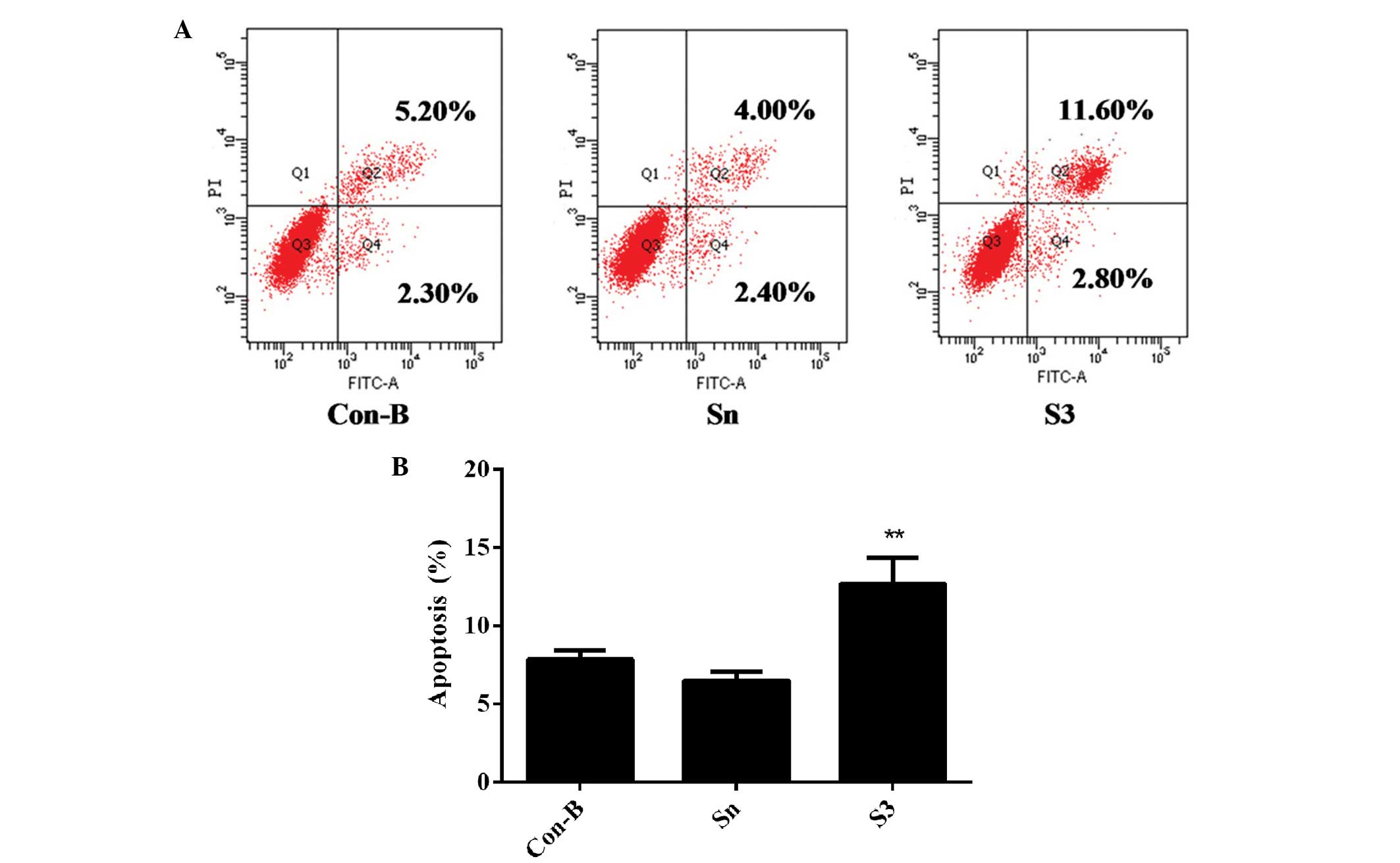To detect whether the effect of HOXB7-S3 on cell proliferation in MCF-7 breast cancer cells occurred by apoptosis, the percentage of early-stage apoptotic cells and late-stage apoptotic cells was measured in three groups by FCM. At 48 h post-transfection of siRNA, the total number of apoptotic cells (12.70±1.75%) was markedly increased in the S3 group, compared with 7.83±0.47% in the Con-B group and 6.46±0.49% in the Sn group, respectively (Fig. 7). The differences between the three groups were statistically significant (**P<0.01). These results indicated that HOXB7-S3 enhanced MCF-7 cell apoptosis.