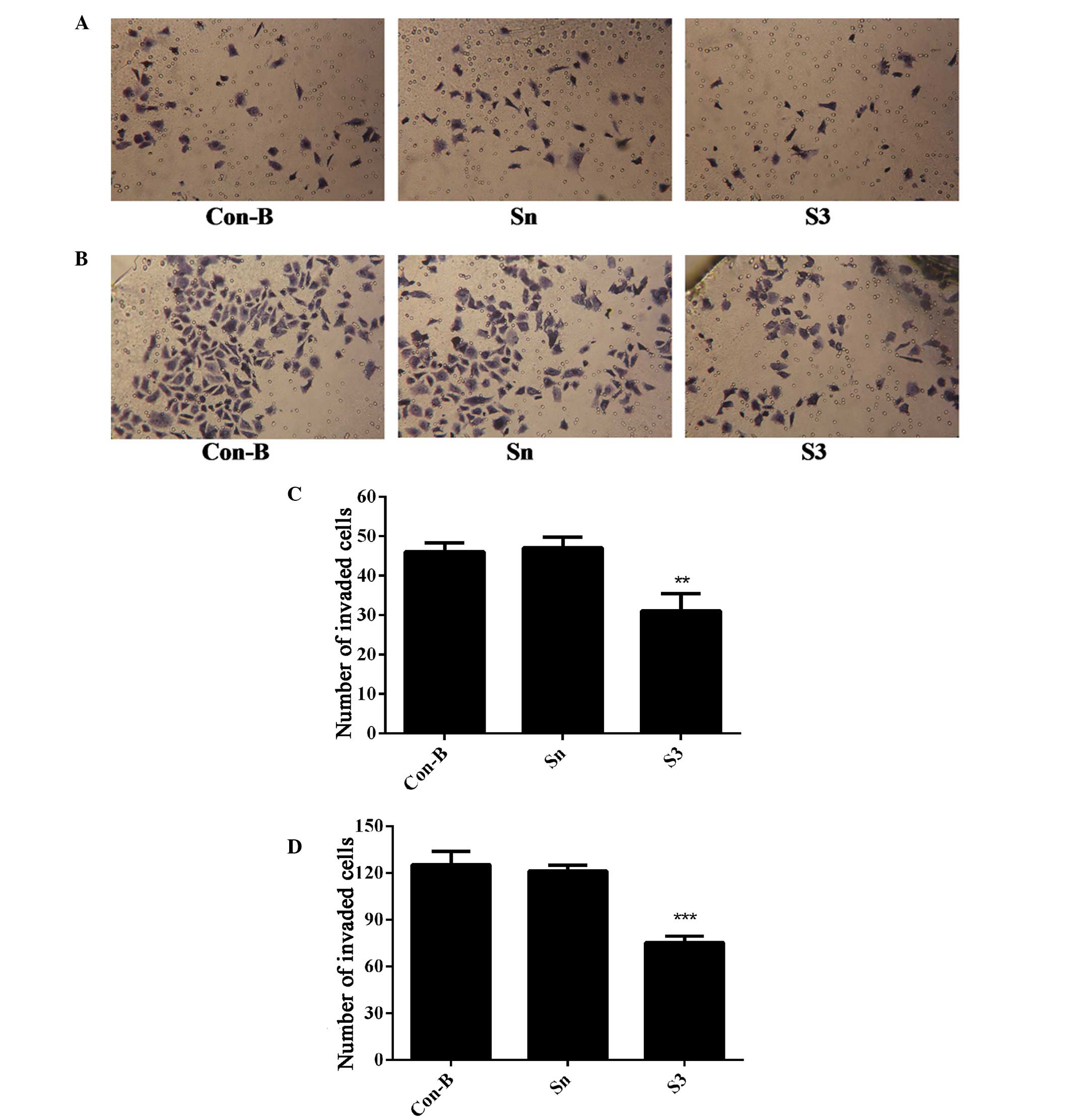 To determine the effect of HOXB7-S3 on cell proliferation in MCF-7 breast cancer cells, the number of cells that had migrated through the Matrigel membrane was measured at 24 and 48 h post-transfection of MCF-7 cells with HOXB7-S3 by Transwell assay. As shown in Fig. 8A and B, the number of migrated cells in the S3 group was markedly reduced compared with in the Sn and Con-B groups. The number of migrated cells in the S3, Con-B and Sn groups 24 h post-transfection was 31±3.63, 46±1.87 and 47±2.27, respectively. The difference was statistically significant (**P<0.01; Fig. 8C). At 48 h post-transfection, the number of migrated cells in the S3 group was 75±3.49, which was apparently reduced compared with 125±7.18 in the Con-B group and 121±3.25 in the Sn group (Fig. 8B). The difference was statistically significant (***P<0.001; Fig. 8D). This suggested that HOXB7-S3 markedly inhibited the invasiveness of MCF-7 cells.