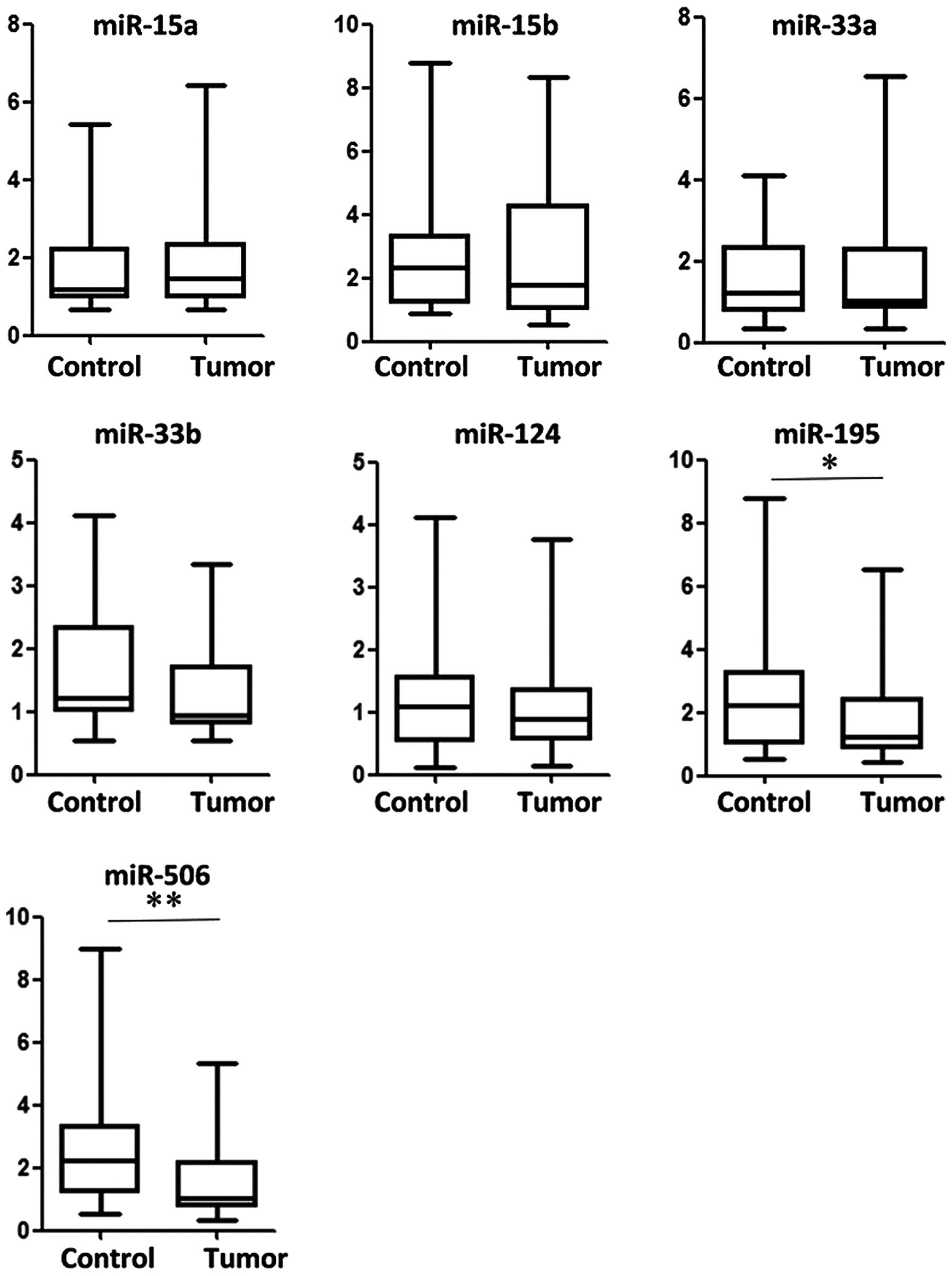 RT-qPCR analysis was used to determine the relative expression levels of 13 selected miRNAs. Total RNA was extracted from tissues, using TRIzol (Invitrogen Life Technologies, Carlsbad, CA, USA) according to the manufacturer's instructions. The expression levels of candidate miRNAs were detected by TaqMan miRNA RT-Real Time PCR (Applied Biosystems Life Technologies, Foster City, CA, USA). Single-stranded cDNA was synthesized by using the TaqMan MicroRNA Reverse Transcription kit (Applied Biosystems Life Technologies, Waltham, MA, USA) and then amplified by using TaqMan Universal PCR Master Mix (Applied Biosystems Life Technologies) together with miRNA-specific TaqMan Minor Groove Binder probes (Applied Biosystems Life Technologies). U6 small nuclear RNA was used for normalization. The experiments were processed using an ABI 7300 PCR Thermal Cycler (Applied Biosystems Life Technologies). The protocol for qPCR was a classic two step PCR: 95°C for 10 min; 95°C for 15 sec followed by 60°C for 1 min for 35 cycles. Each sample in each group was measured in triplicate and the experiment was repeated at least three times. The relative expression was calculated using the ΔΔCt method. The products were separated by 2% agarose (Sigma-Aldrich) to confirm the specificity of the PCR reaction.