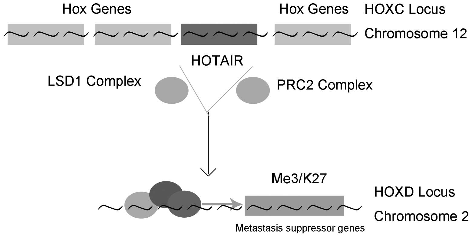 Polycomb proteins are a group of proteins involved in the repression of transcription of thousands of genes, which are critical in differentiation, maintenance of cell identity and cancer development (20,29,30). Polycomb proteins act in several protein complexes, polycomb repressive complex (PRC) 1 and PRC2. PRC2 is a histone H3 lysine 27 (H3K27) methylase and, by modulating H3K27 methylation, PRC2 is involved in developmental gene silencing and cancer progression (28,31). The association between lincRNA and plycomb proteins to induce silencing is considered a common mechanism in the epigenetic regulation of lncRNAs, including HOTAIR. The core PRC2 cannot target and silence genomic regions alone. Instead, HOTAR binding is required to guide PRC2 to the specific regions of the genome, where PRC2 associates and epigenetically silences the gene expression. HOTAR binding results in genome-wide retargeting of PRC2. HOTAIR contains two independently binding domains, 5′ and 3′ domains, which bind the PRC2 and lysine-specific demethylase 1 (LSD1) complexes, respectively. The HOTAIR-PRC2-LSD1 complex then targets the HOXD locus on chromosome 2, silencing the genes involved in the suppression of metastasis (32), as shown in Fig. 1. It is clear that HOTAIR reprograms the chromatin to promote cancer metastasis. However, the precise mechanism of the activities of HOTAIR remains to be elucidated.