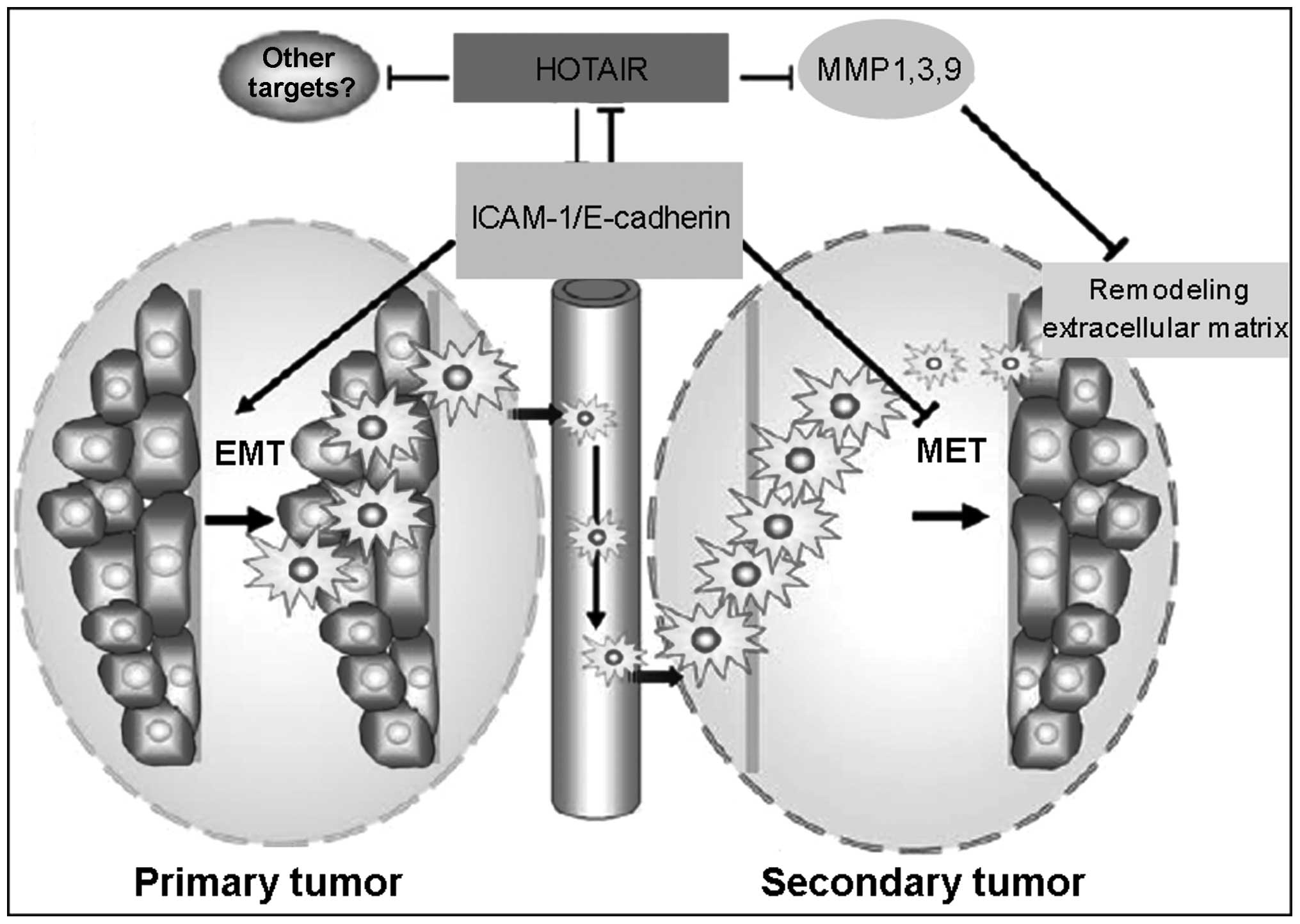 It has been suggested that HOTAIR may be involved in EMT/CSC establishment by regulating certain critical molecular signaling pathways. A potential explanation may be found in the HOTAIR targeting of intercellular adhesion molecule (ICAM)-1 and members of the matrix metalloproteinase (MMP) family, including MMP1, MMP3 and MMP9 in gastric cancer (41). MMP1 and MMP3 have been reported to be suppressed by HOTAIR knockdown (41), and MMPs can favor metastasis by remodeling the ECM and degrading the basement membrane. In addition, HOTAIR facilitates the ubiquitination and, thus, accelerates the degradation of Ataxin-1. Ataxin-1 has been demonstrated to activate the promoter of E-cadherin, which is a key tumor suppressor that suppresses the invasiveness of cancer cells (55–57). These findings indicate that HOATIR may promote metastasis through the regulation of the metastasis-associated genes, including MMPs and Ataxin-1 (Fig. 2).