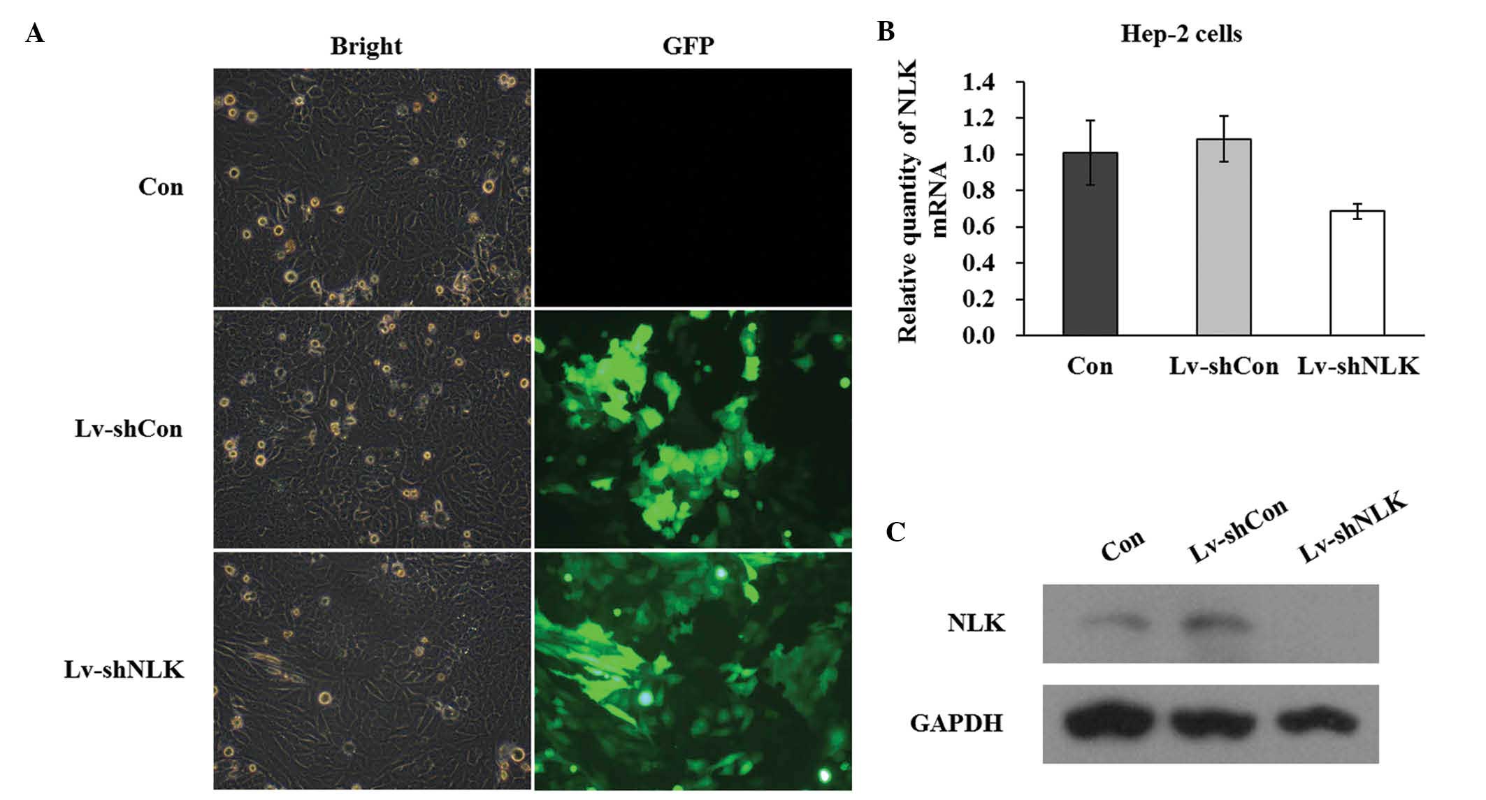 In order to knock down the NLK gene in Hep-2 cells, GFP containing lentivirus-mediated infection of NLK siRNA was performed. The successful infection was confirmed by evaluating the expression level of GFP. As shown in Fig. 1A, 5 days after NLK infection, >90% of cells expressed GFP, indicating a high infection efficiency. The mRNA expression level of NLK following infection with siRNA was evaluated by qPCR. Quantitative analysis of NLK mRNA level using densitometry revealed a significant decrease in Lv-shNLK (36.6%) compared with the control (Fig. 1B). In addition, western blot assays demonstrated that the protein expression of NLK in the two Hep-2 cell lines was significantly suppressed by NLK-specific siRNA expression (Fig. 1C). Collectively, these data suggested that lentivirus-mediated siRNA successfully infected Hep-2 cells and in addition, may be used to investigate NLK loss of function effects in Hep-2 cells.