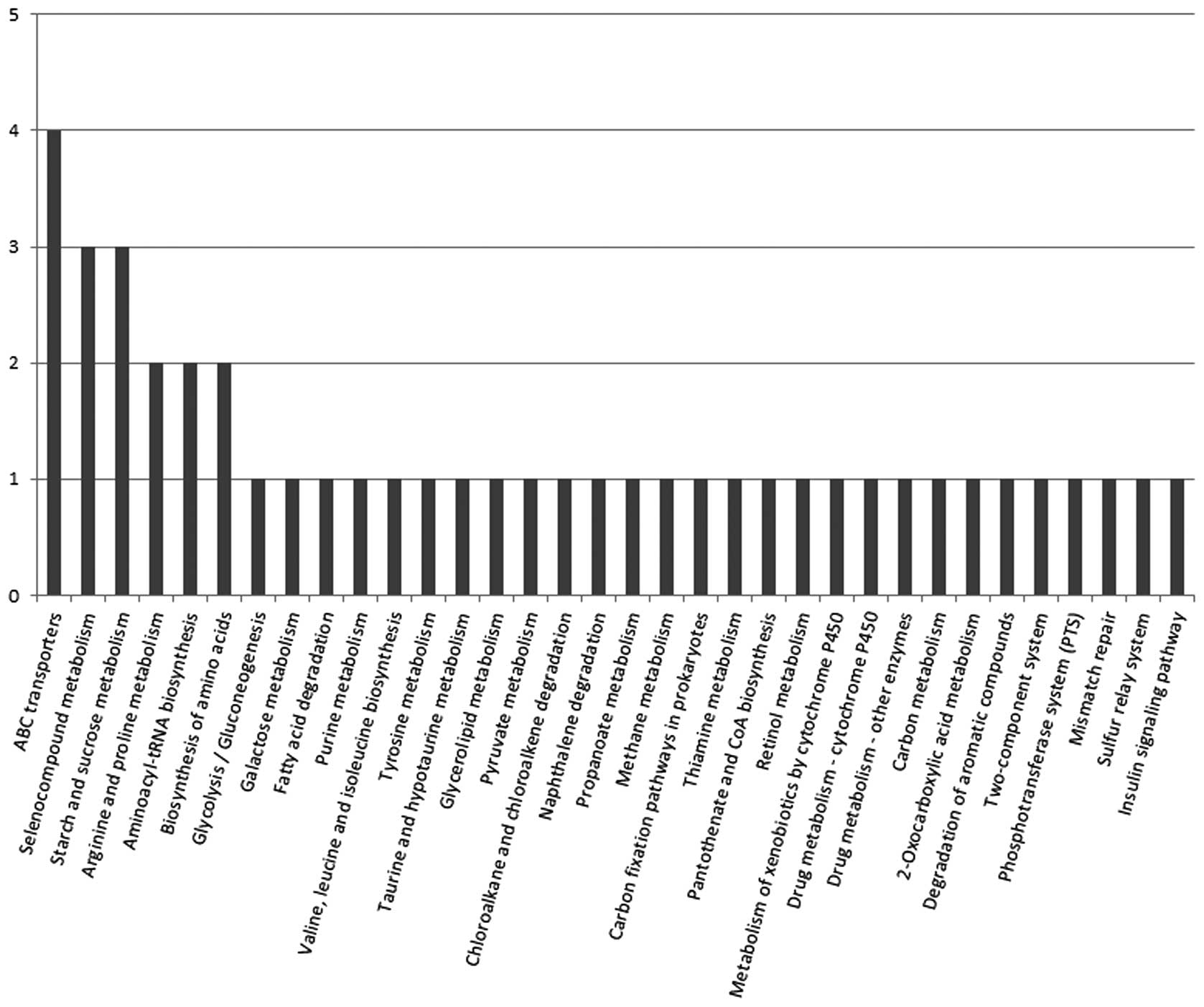 KAAS was used to align target-protein and Streptococcal sequences from the KEGG GENES database, and the KO identifiers of homologous/similar proteins were assigned to the relevant KEGG pathways. A total of 34 KEGG signal/metabolic pathways associated with the sequences of 21 differential proteins were extracted (Fig. 3).