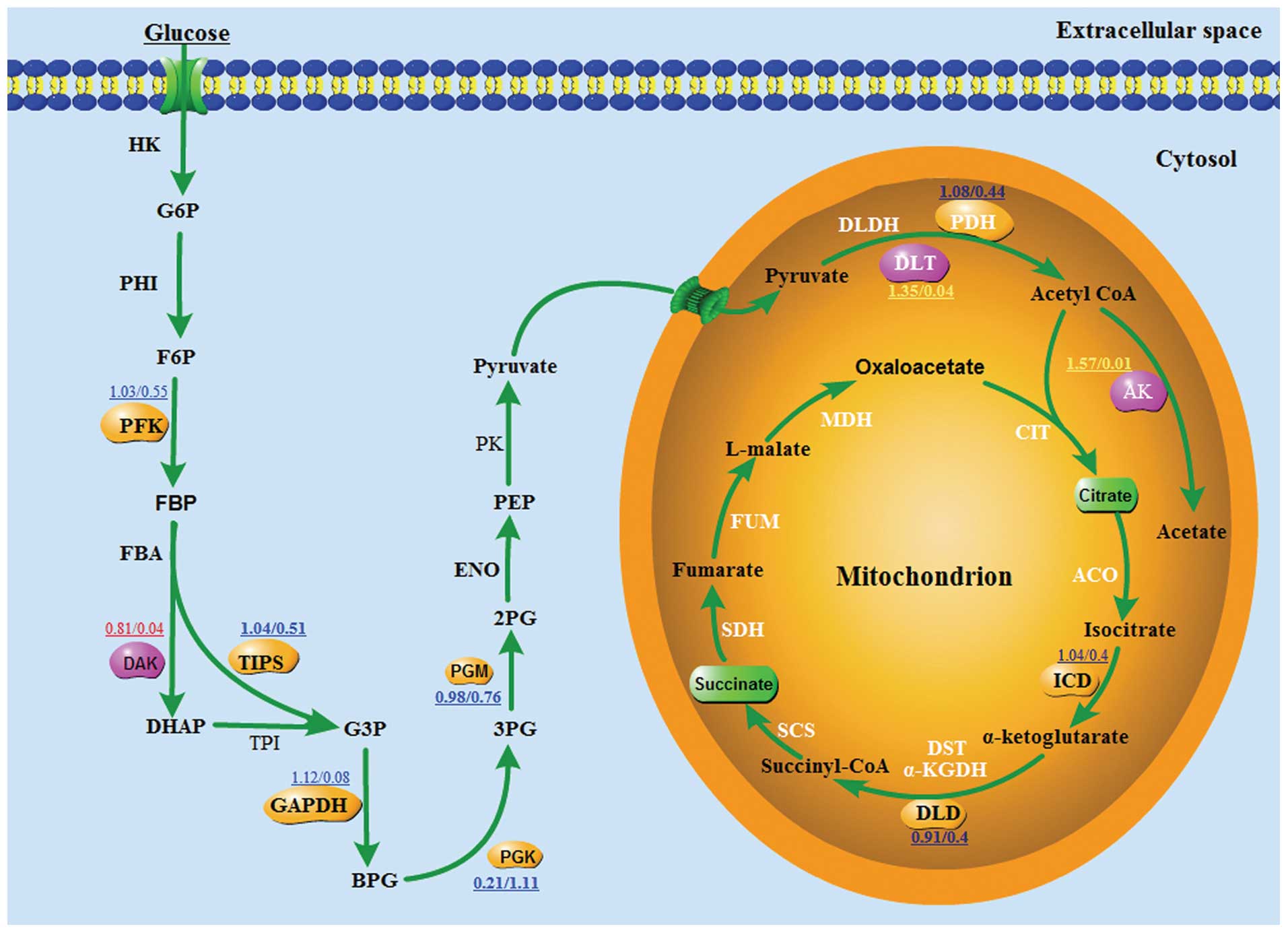 The data of the metabolic pathway analyses indicated that dihydrolipoyl transacetylase and dihydroxyacetone kinase and acetate kinase exhibited differential effects on the carbon metabolism between the native S. suis type 2 and ccpA mutant strains. These differential effects on the carbon metabolic pathways between the native and the ccpA mutant strain indicate that ccpA is directly or indirectly involved in the carbon metabolism of bacteria. In particular, ccpA was indicated to have certain effects on the cellular metabolism of bacteria (Fig. 4).