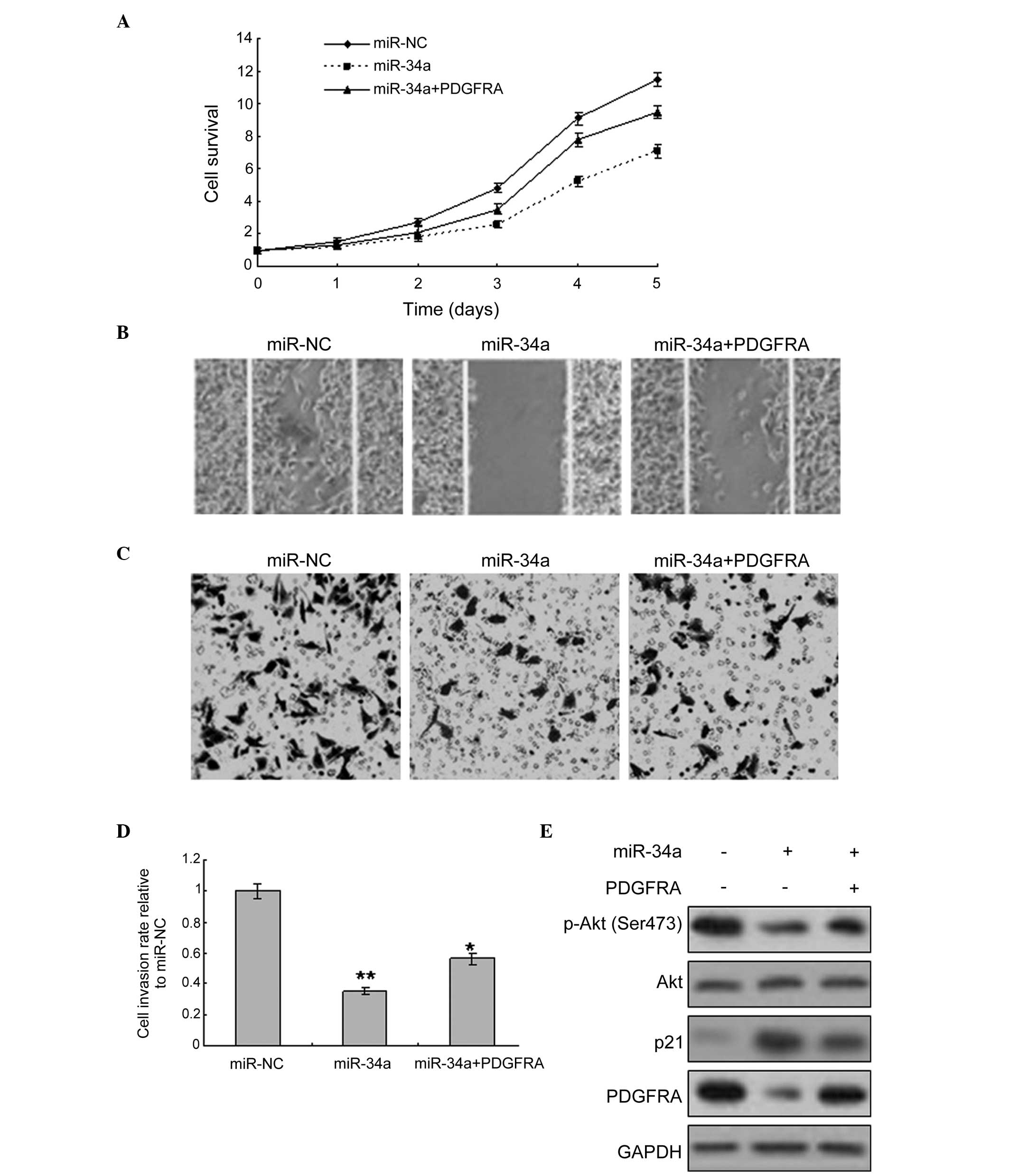 The above-mentioned data indicate that PDGFRA is a target gene of miR-34a. In the present study, elucidating whether miR-34a regulates biological behavior, such as proliferation, apoptosis and metastasis was investigated. PDGFRA overexpression was used to assess whether miR-34a inhibited HT-29 cell metastasis. The result revealed that miR-34a expression in the cells inhibited proliferation of HT-29 cells with or without PDGFRA overexpression (Fig. 4A). The migration and invasion of the cells increased with PDGFRA expression, and when the cells were infected with LV-miR-34a, migration and invasion were decreased (Fig. 4B-D). As the PDGFRA-mediated signaling pathway is an important pathway involved in cancer development, various proteins and downstream proteins in the signaling pathway, such as Akt, were detected and observed to be decreased by miR-34a overexpression (Fig. 4E).